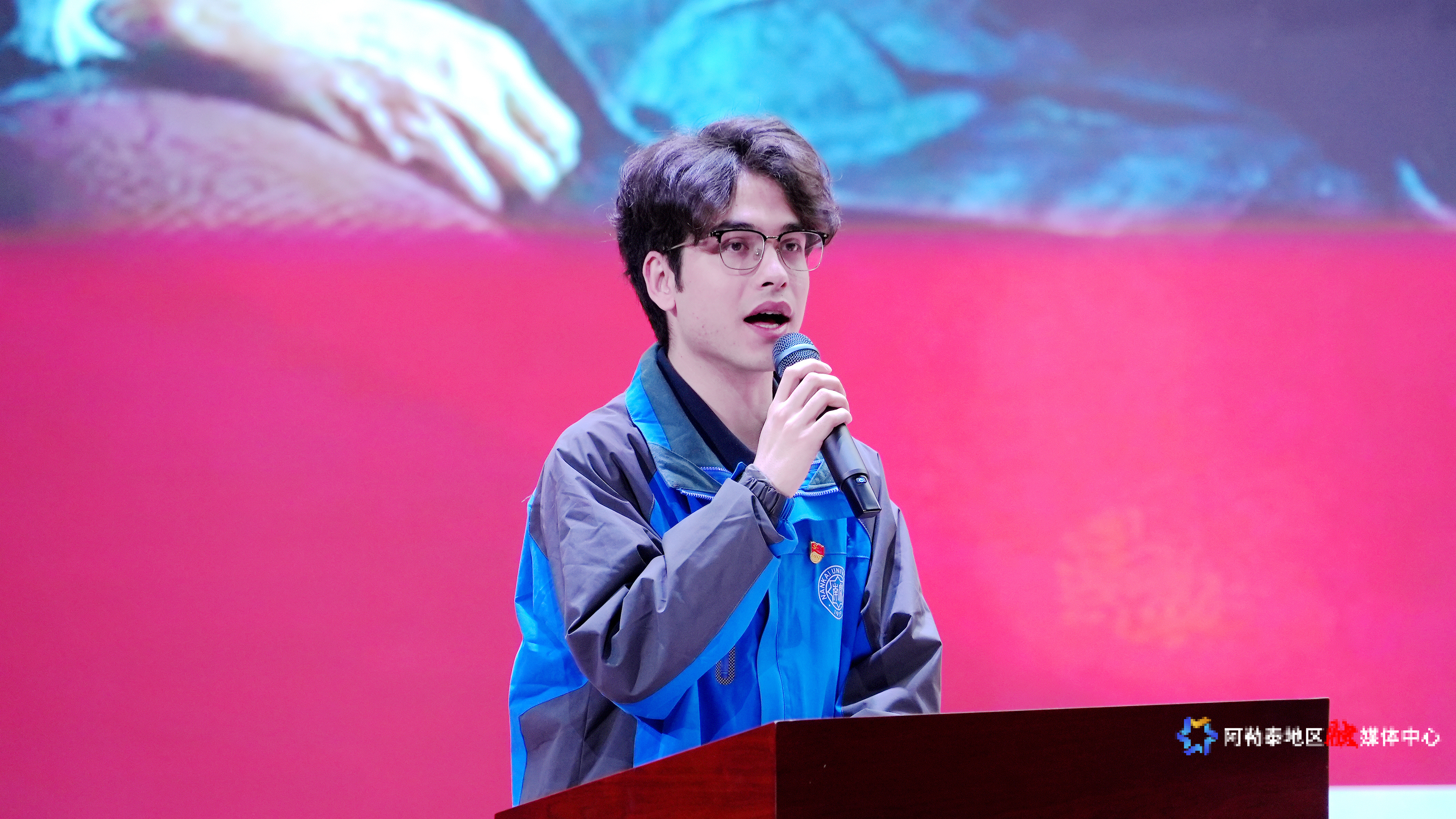 铸牢中华民族共同体意识、建设社会主义现代化新疆“雪都石榴红”宣讲团赴基层巡回宣讲活动现场,阿勒泰地区二中支教老师阿米尔江·阿力木正在宣讲。