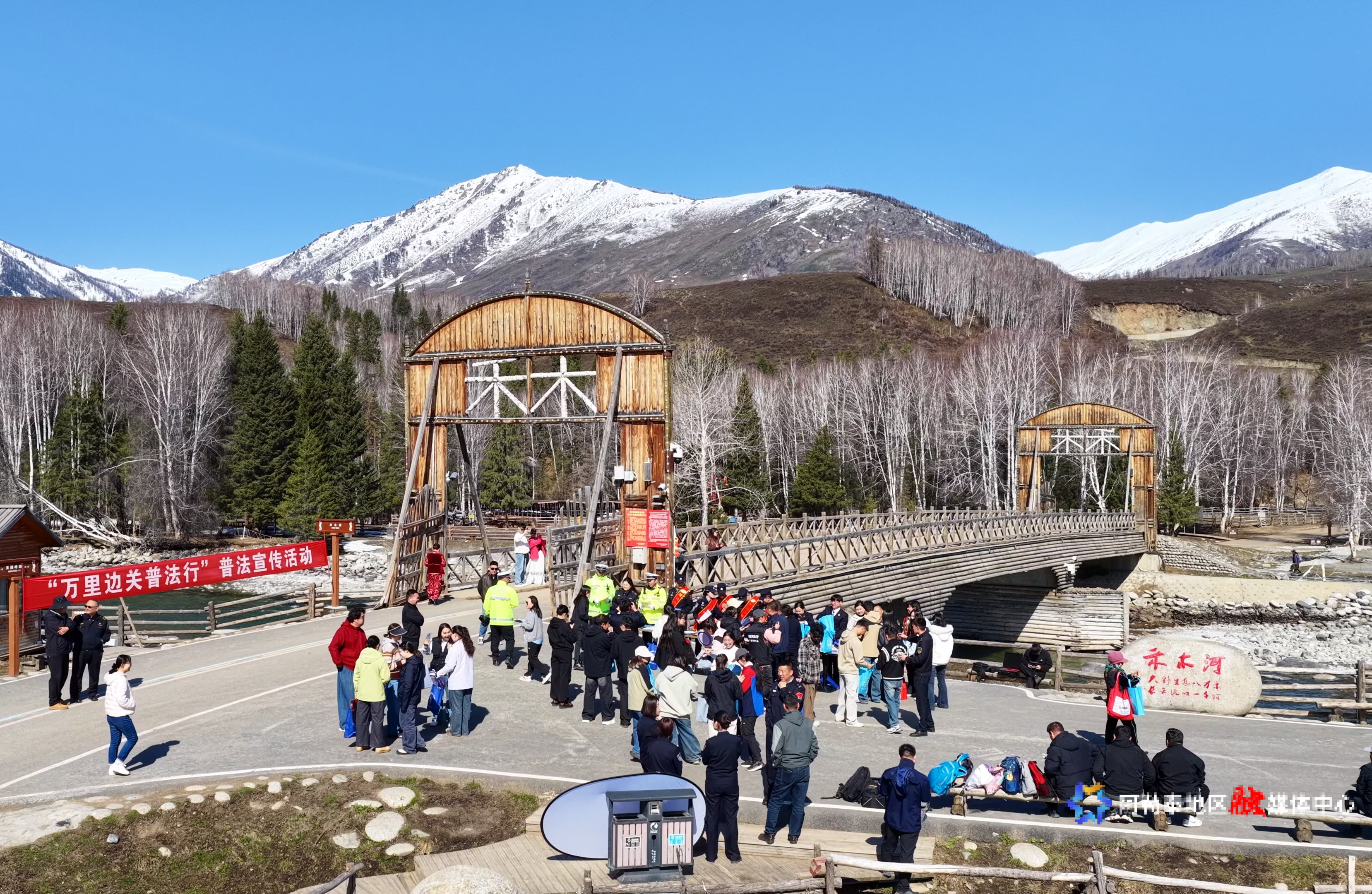 阿勒泰新闻网-阿勒泰地区融媒体中心(记者 杨玮璇 实习记者 王景鸿)4月21日,“万里边关普法行”实地普法宣传活动走进布尔津县禾木喀纳斯蒙古族乡,在当地特色文化地标百年老屋前火热开展。活动立足边境牧区与旅游景区双重定位,将法治宣传与民俗文化、文旅场景深度融合,以趣味互动转盘答题、创意打卡、禾木桥民族舞蹈表演等鲜活形式,让普法接地气、入人心。