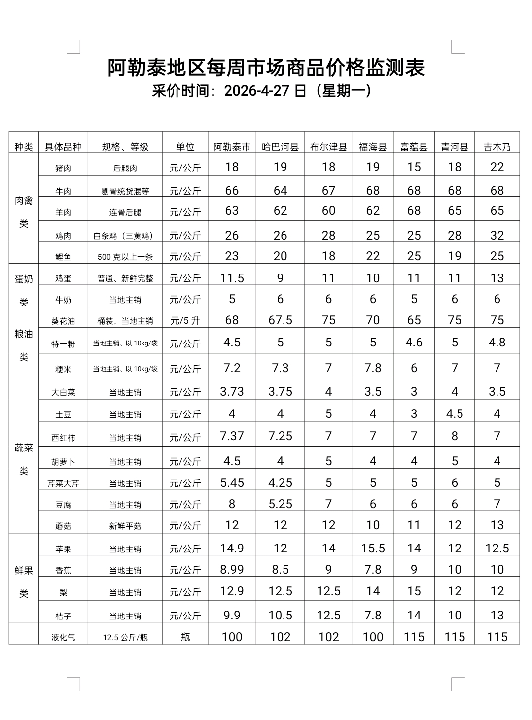 阿勒泰地区每周市场商品价格监测表