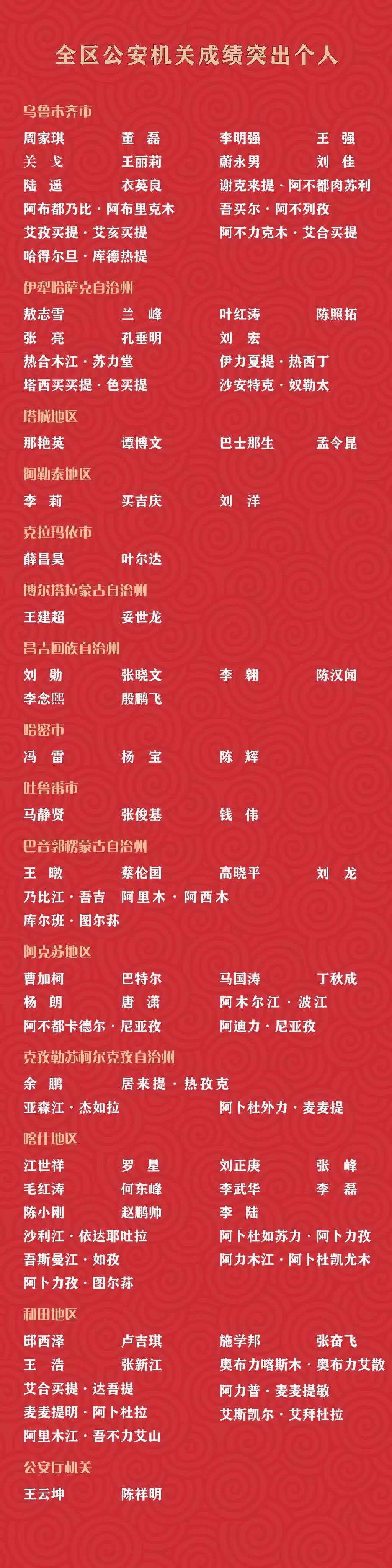 获评全区公安机关成绩突出个人分别为:哈巴河县公安局某大队大队长刘洋、富蕴县公安局治安大队李莉、喀纳斯景区公安局交警大队副大队长买吉庆。三名民警扎根不同公安岗位,分别深耕安全守护、治安管控、景区交通保障等一线履职赛道,恪尽职守、冲锋在前,迎难而上攻坚急难任务,用心用情办好民生实事,以过硬业务能力、优良工作作风,全力守护辖区平安稳定,践行“人民公安为人民”的初心使命。
