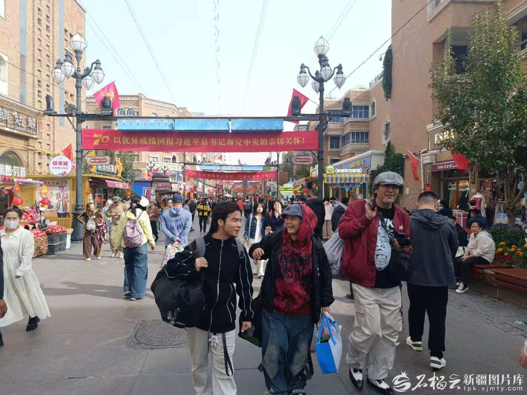 在步行街上,人潮涌动,随处可以看到手里挥动着国旗的游客、市民,他们并不相识,但是心愿都是同一个:祝福祖国繁荣昌盛。来自四川的游客张昊然和同伴们,原本正在挑选手鼓,忽然身边有人齐唱《我和我的祖国》——原来是大巴扎步行街举行的“我把新疆唱给你听”快闪活动。很快,他们就加入合唱的队伍,“在‘歌舞之乡’唱这首歌,感觉每个音符都带着葡萄干的甜蜜!”他说,在新疆旅游,最让他们感动的,就是“感受新疆的团结氛围”,“互不相识的游客与当地人在一起,挥动国旗齐声高歌的场景,太感人了!”