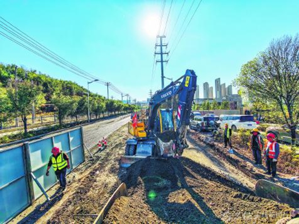 10月4日,挖掘机在乌鲁木齐市东泉路提升改造工程施工现场作业。施工人员各司其职,全力推进项目建设。天山网-新疆日报记者周鹏摄