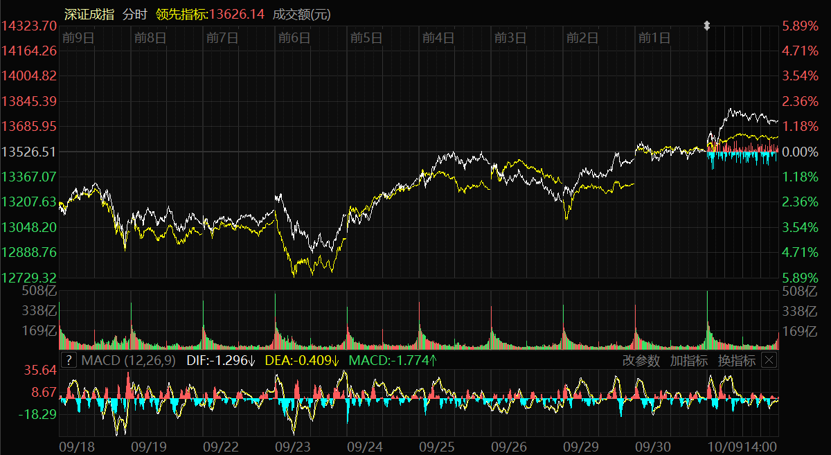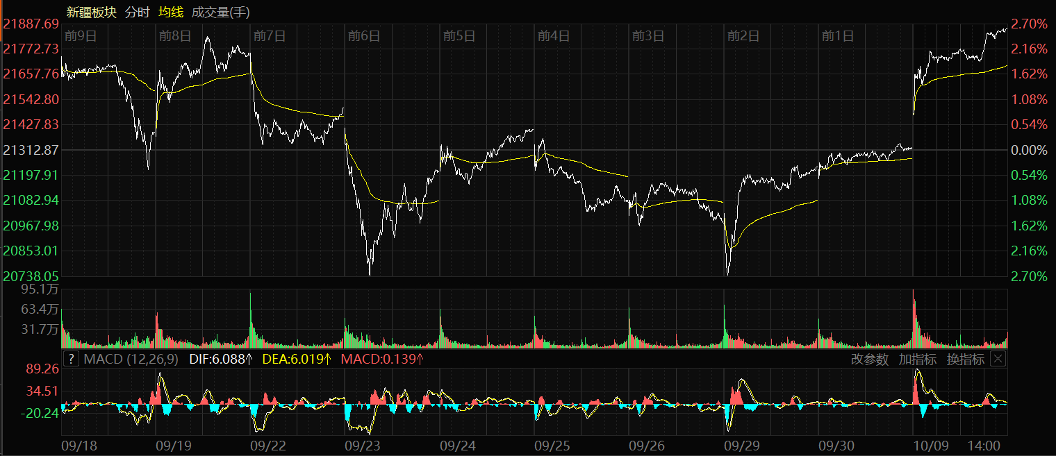 天山网-新疆日报讯(记者冉虎报道)10月9日,A股迎来10月“开门”红走势,上证指数突破3900点,再创十年新高。截至收盘,上证指数涨1.32%,报收3933.97点;深证成指涨1.47%,报收13725.56点;创业板指涨0.73%,报收3261.82点。沪深两市成交额达26532亿元,较9月30日大幅放量4718亿元。