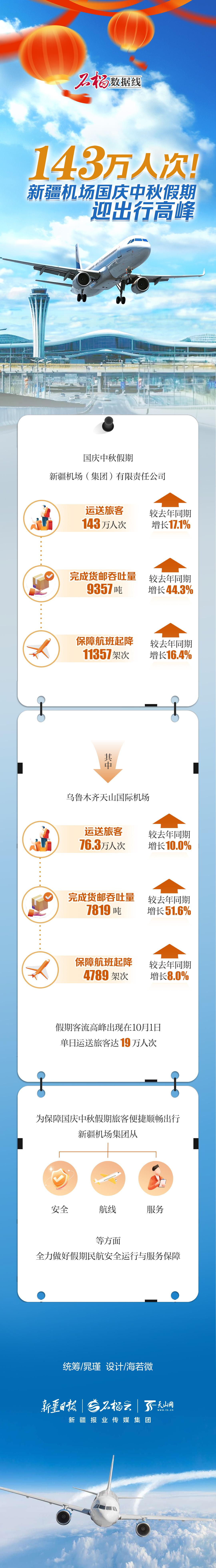 国庆中秋假期,新疆机场(集团)有限责任公司运送旅客143万人次,完成货邮吞吐量9357吨,保障航班起降11357架次,较去年同期分别增长17.1%、44.3%、16.4%。