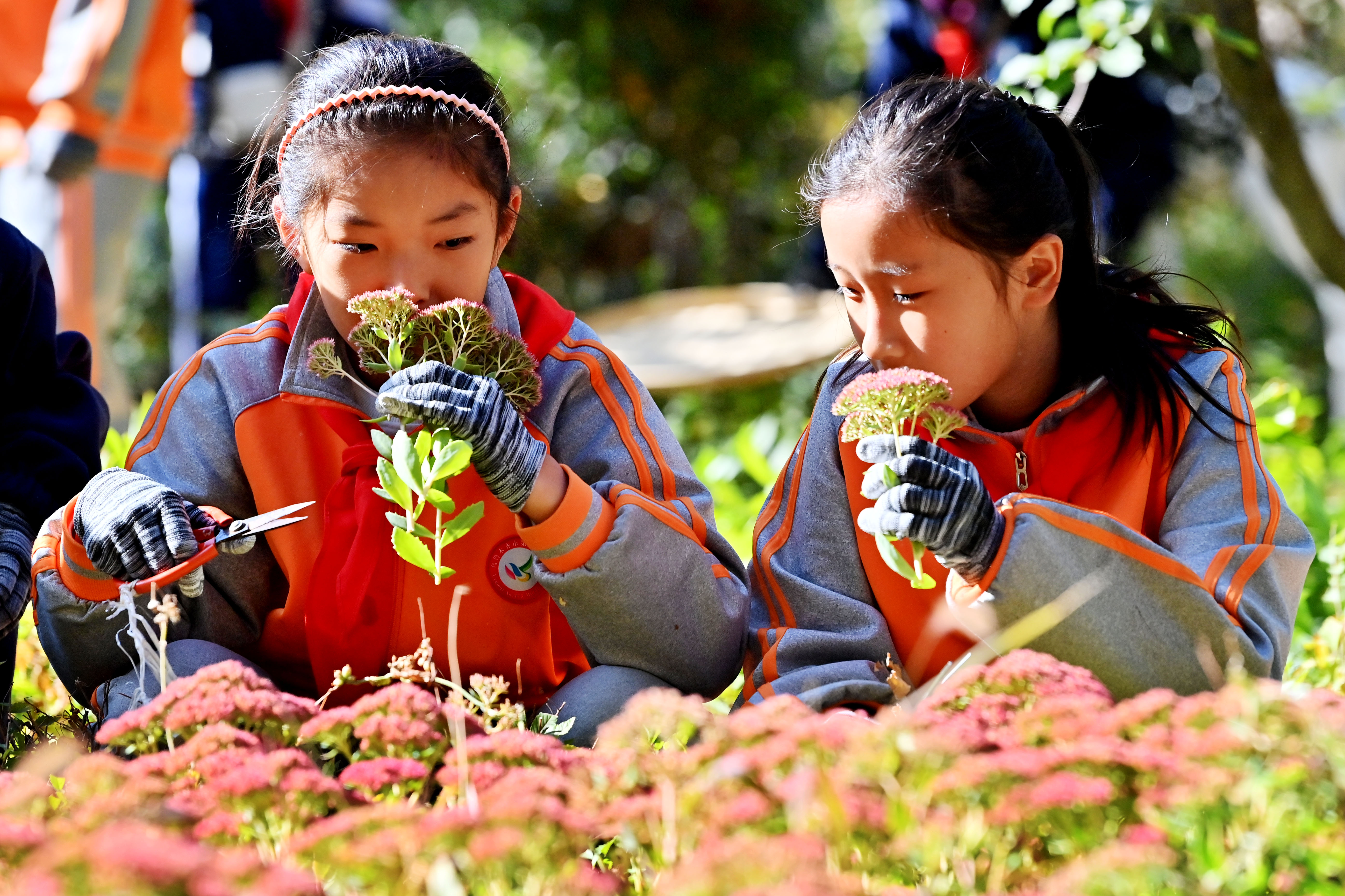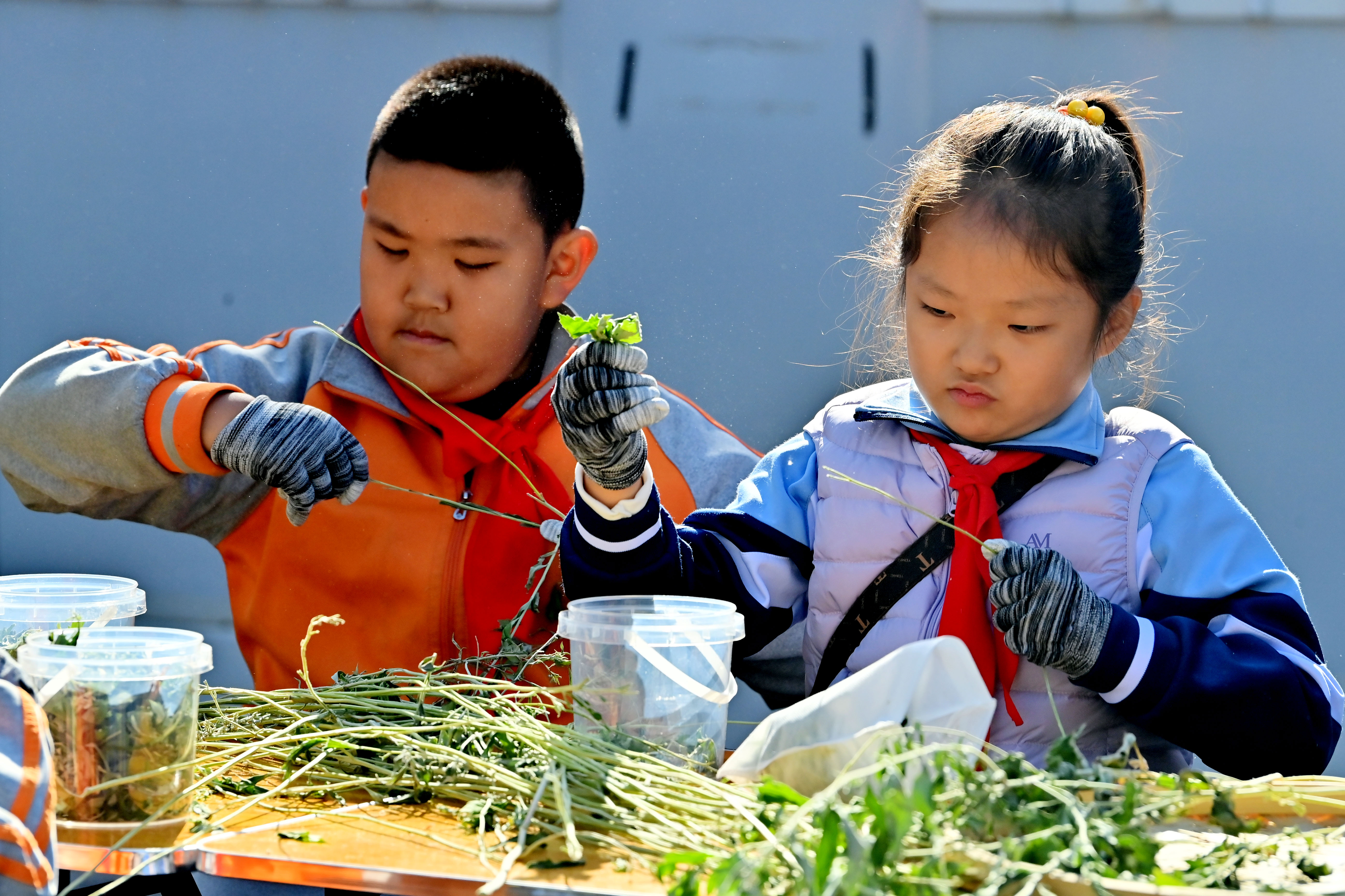 10月10日,同学们在乌市沙区环卫路社区卫生服务中心的草药种植区里采摘草药。石榴云/新疆法治报记者 单坤摄