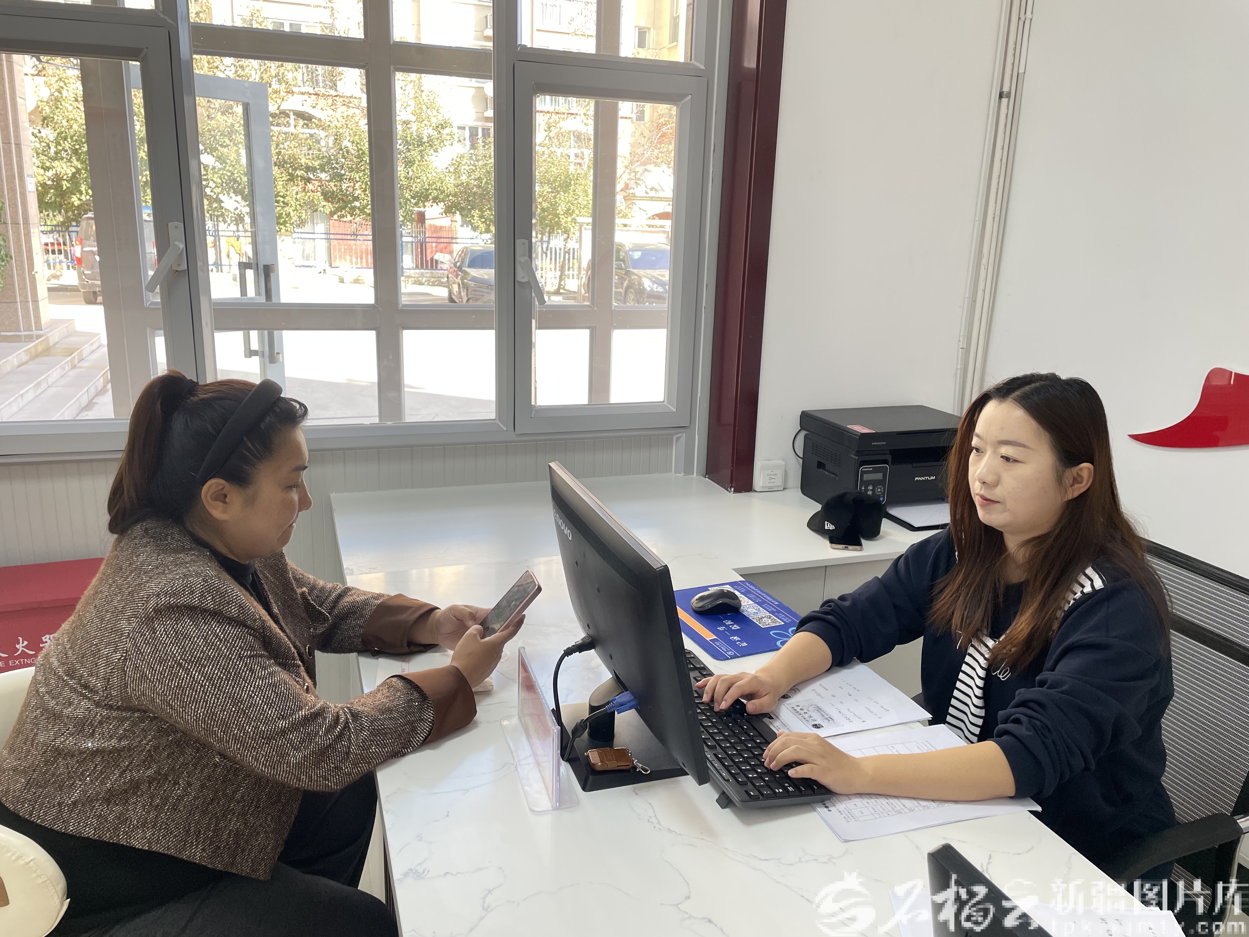 10月9日,奇台县奇台镇康居社区服务大厅,民政协理员在给居民办理业务。董雪艳摄