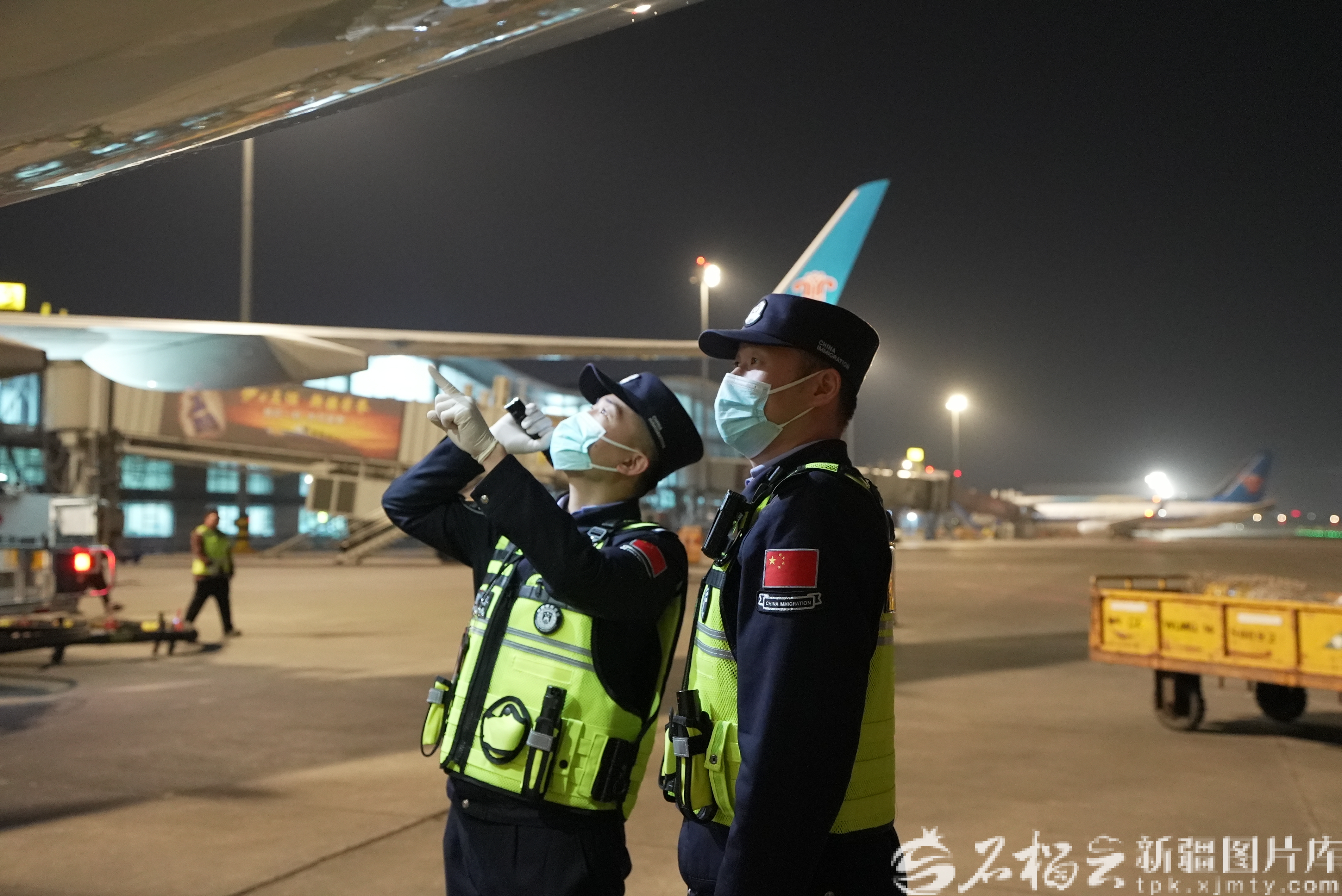 10月10日晚,乌鲁木齐边检站执勤民警在检查一架货机。冯艺萌 摄