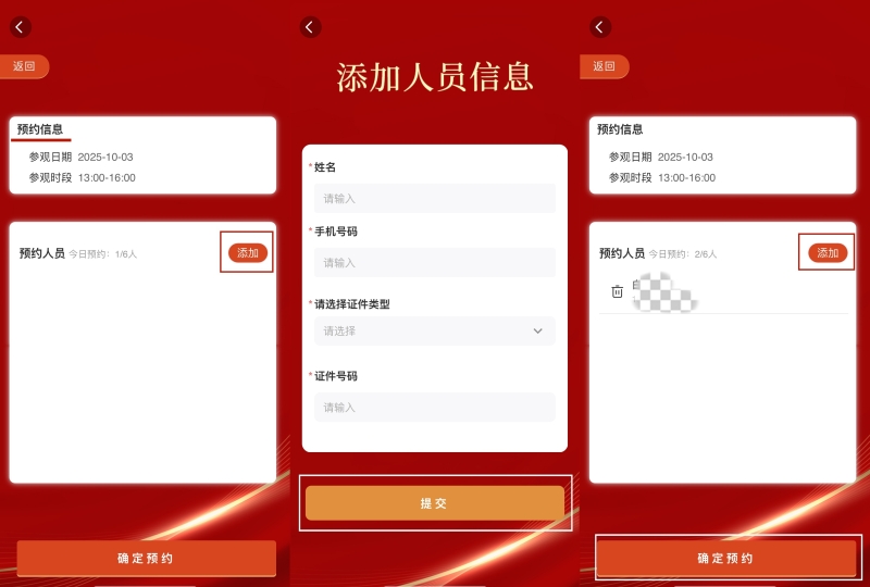 三、点击“添加”添加预约人员信息。输入姓名、手机号码,选择证件类型并输入证件号码,确保信息无误。每个账号单次可预约6张参观门票,确认输入所有预约人员信息后,点击“确定预约”。