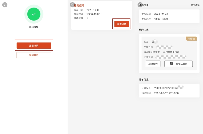四、预约完成后,点击“查看详情”就能看到预约信息,还能取消预约或保存二维码(截图存好并携带相关证件,入馆核销超方便)。