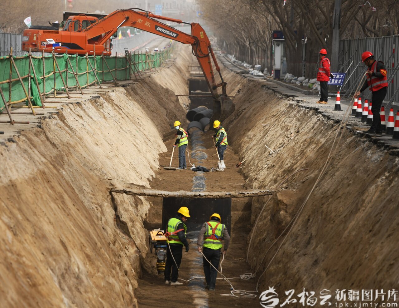 3月12日,工人在库尔勒市建国北路地下管网改造工程现场填埋安装排水管道。王立华 摄
