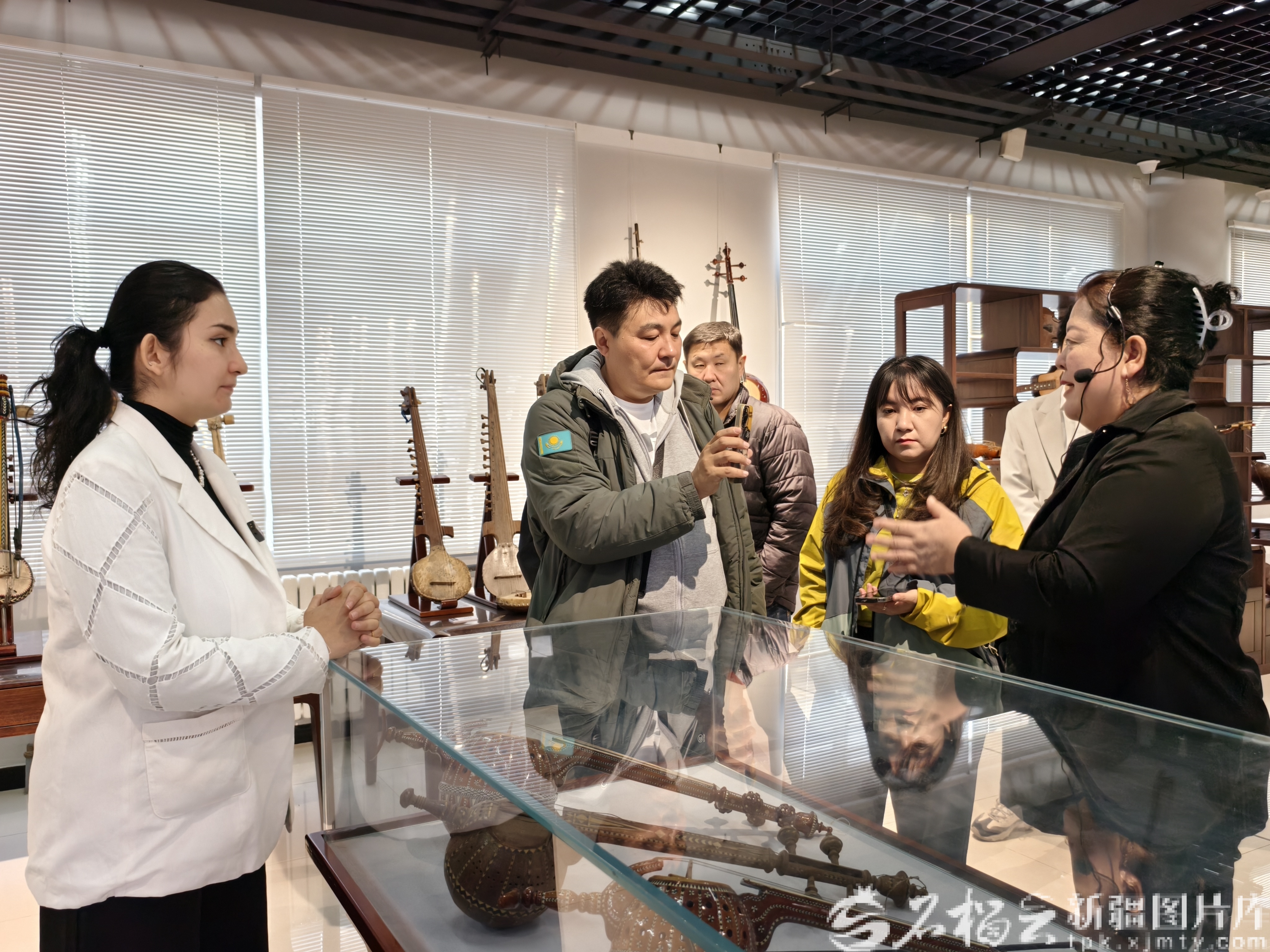 艺术的魅力跨越国界。13日上午,在新疆艺术学院万桐书木卡姆文献馆展厅内,参访团成员或凑近聆听工作人员讲解乐器背后的故事,沉浸式感受木卡姆艺术的独特韵味;或驻足用手机记录古老乐器独特的造型与工艺细节,脸上满是对新疆保护非物质文化遗产成果的好奇与赞叹。