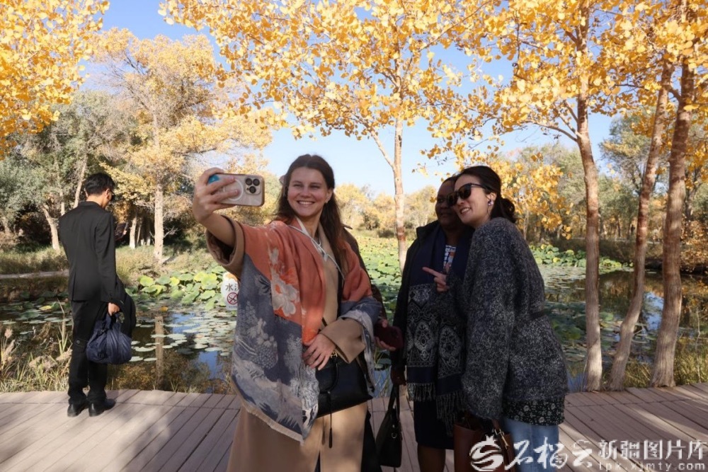 10月的新疆,秋意正浓,13日上午,参访团一行前往泽普金湖杨国家森林公园参观考察。湛蓝天空、清澈湖水、金色胡杨,宛如一幅绝美画卷。