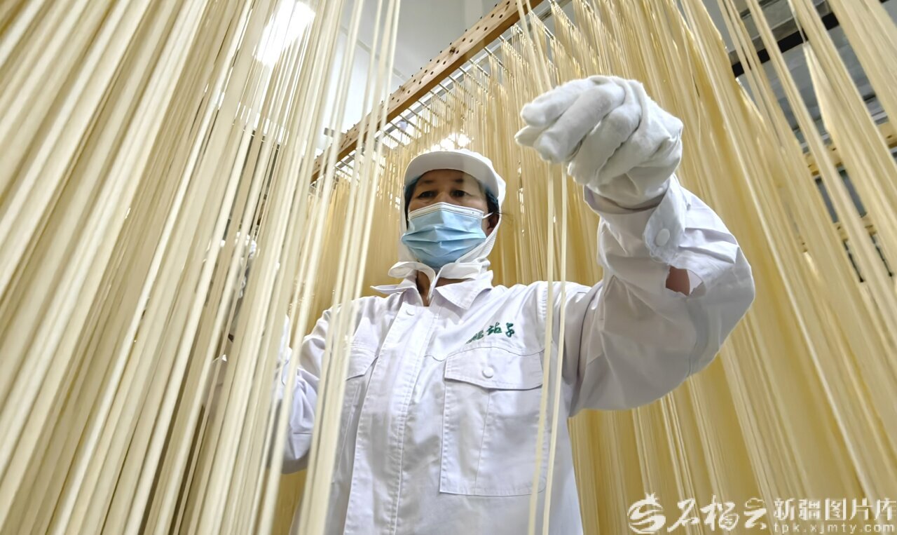 奇台县半截沟镇腰站子村农业产业园,工人在将晾晒的挂面进行分面(资料图)。