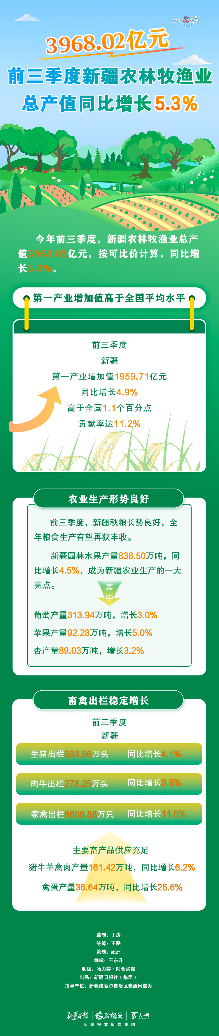 数说“新”变化丨3968.02亿元 前三季度新疆农林牧渔业总产值同比增长5.3%