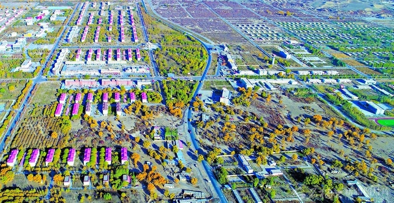 新疆生产建设兵团第二师38团南屯镇(路左)与且末县奥依亚依拉克镇,315国道从两镇之间穿越而过(10月22日无人机摄)。严君峰摄