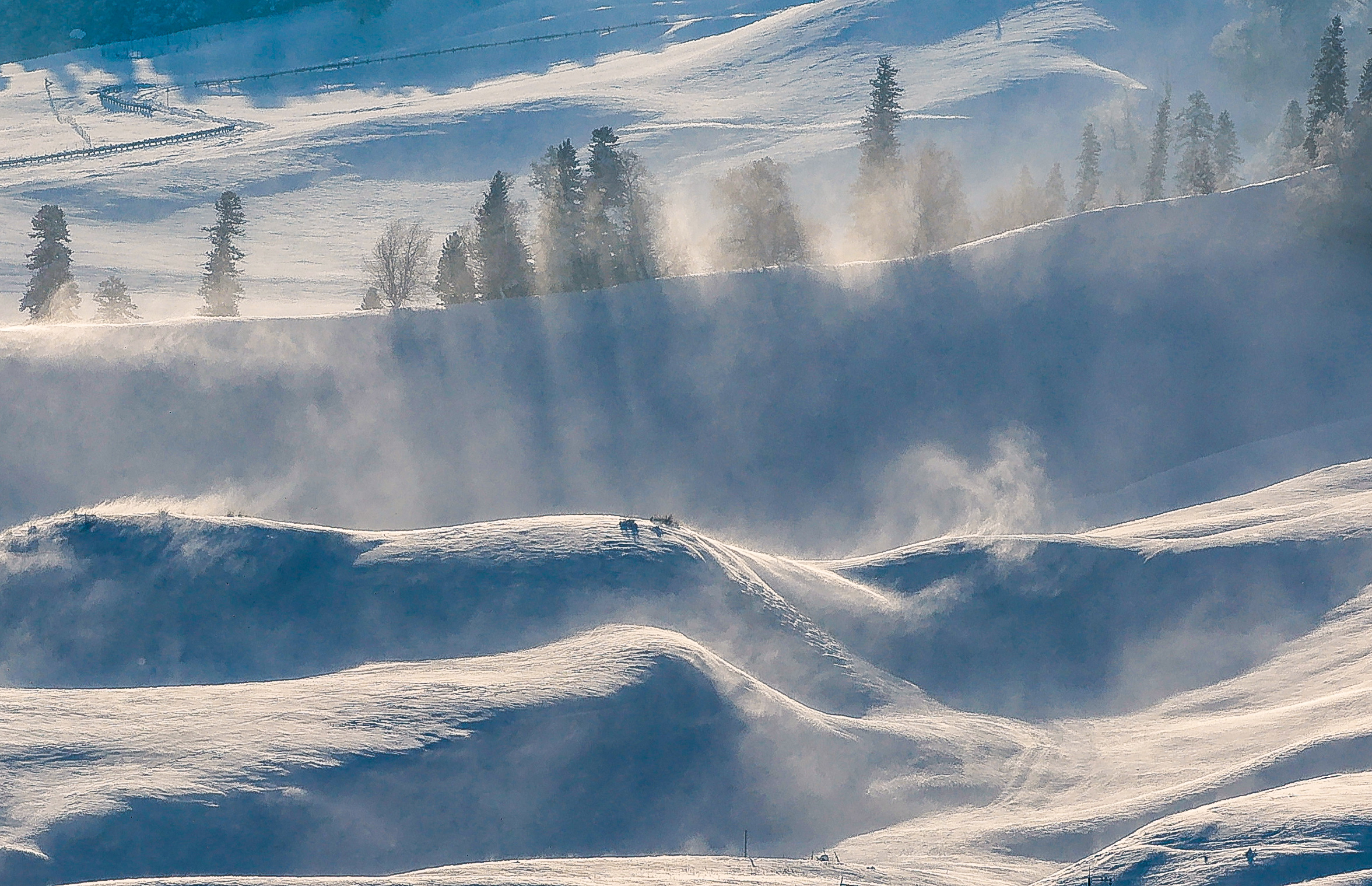 东风卷起地面细碎雪粒,形成灵动的“风吹雪”,雪雾在晨光中流转,宛如轻纱漫舞。