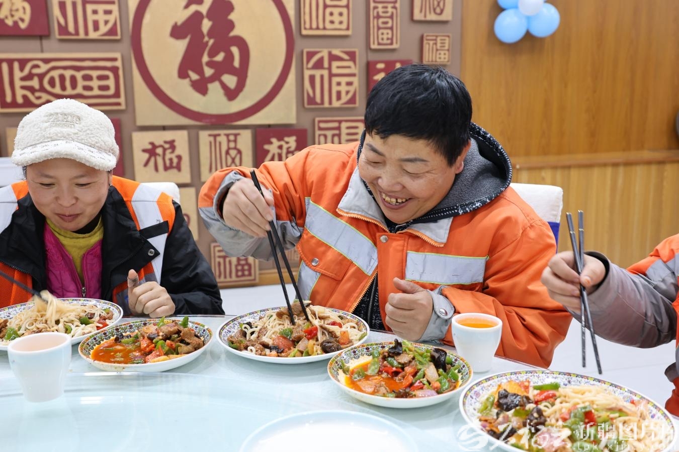 热腾腾的拌面端上桌,刚完成路段清雪的环卫工人围坐在一起,吃得酣畅淋漓。