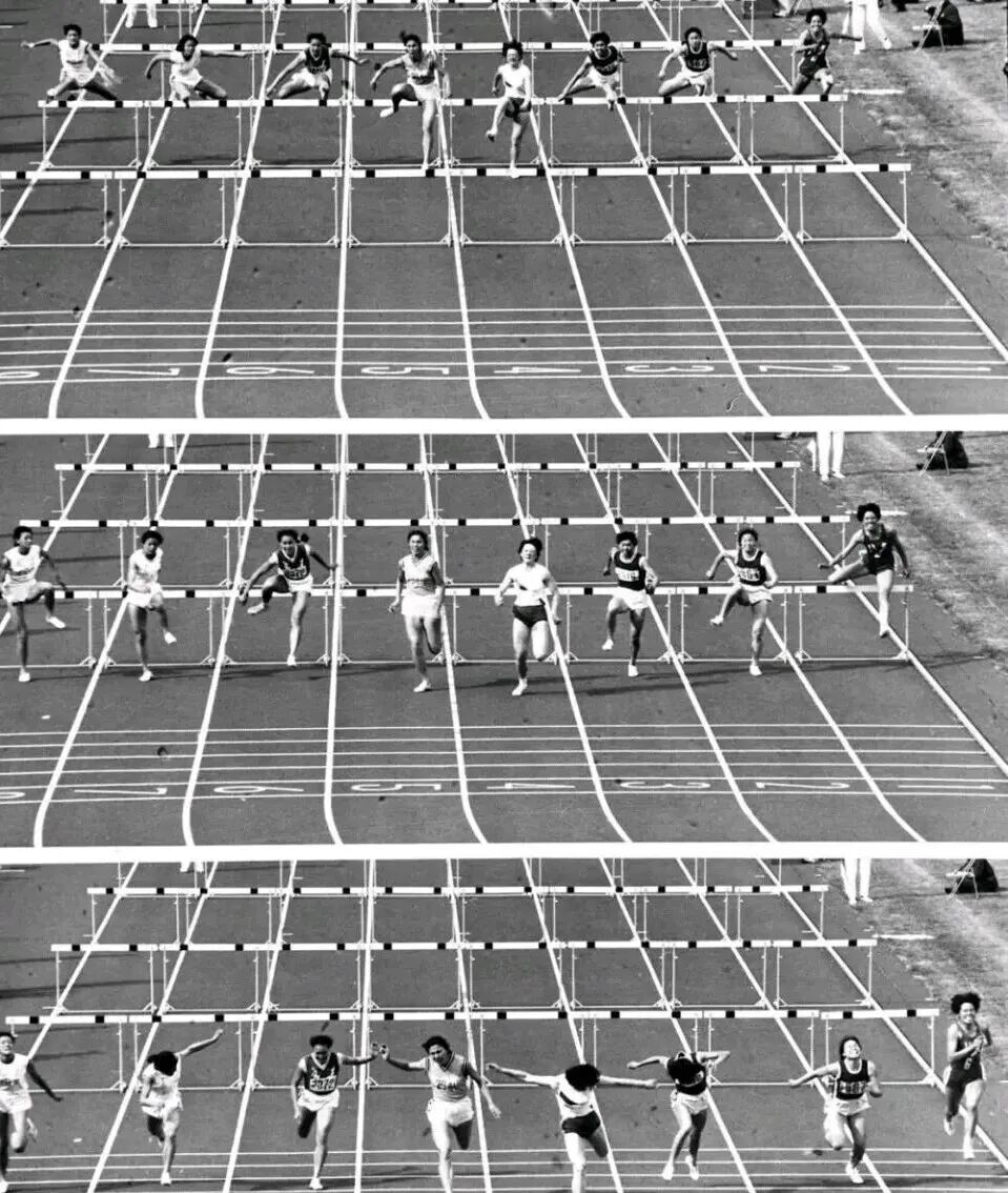1979年9月24日,第四届全运会女子100米栏决赛终点处的连续动作摄影:8名选手几乎同时向终点冲刺,其中,右起第四人是获得冠军的新疆运动员戴建华。新华社记者 张赫嵩 摄