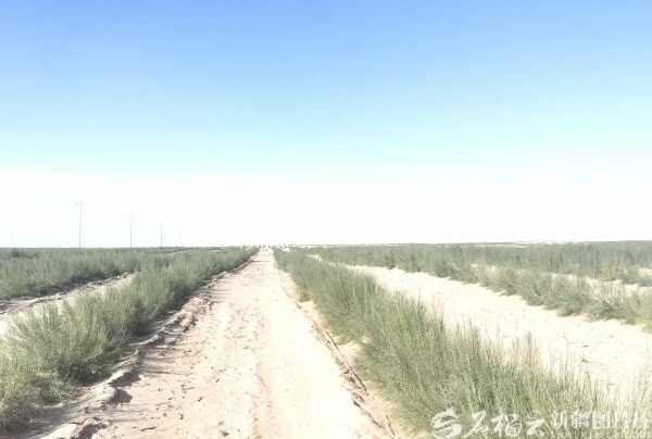 今年3月在沙雅县盖孜库木乡沙漠边缘种植的2.5万亩梭梭林,已形成约5公里宽的绿色防护带。天山网-新疆日报记者 曹华摄