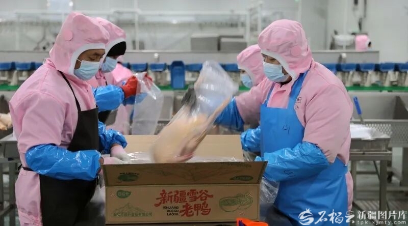 在百福升农牧发展有限公司加工车间,工人们正忙着将鸭肉制品装箱。图/塔城地区融媒体中心提供