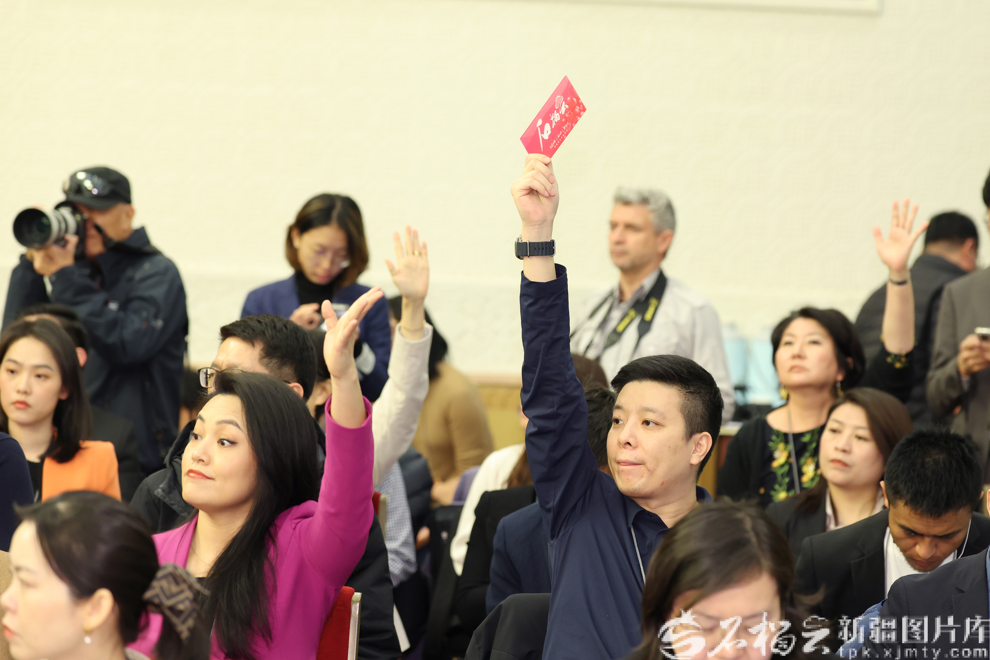 2024年3月7日,十四届全国人大二次会议新疆代表团在人民大会堂新疆厅举行全体会议,并向中外媒体开放。时政新闻部主任姚彤(二排右二)与其他中外媒体记者踊跃举手提问。天山网-新疆日报记者 崔志坚摄