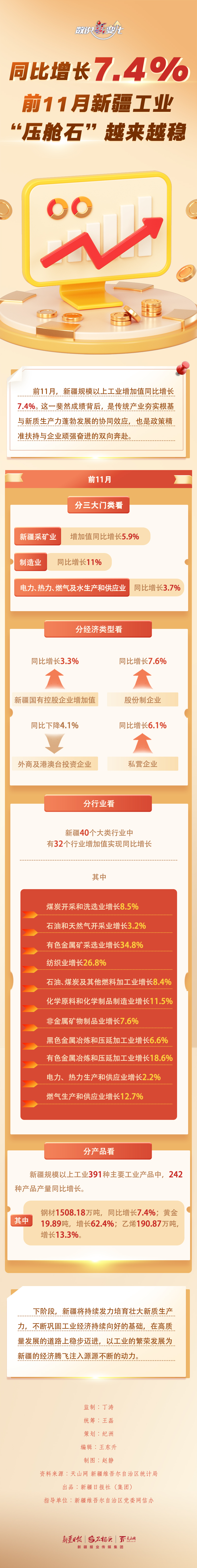 前11月,新疆工业经济运行总体态势平稳且向好,重点行业更是发挥坚实的支撑作用,全疆规模以上工业增加值同比增长7.4%。 哪些行业表现突出?哪类企业增长快?今天的《数说“新”变化》一起来看看。