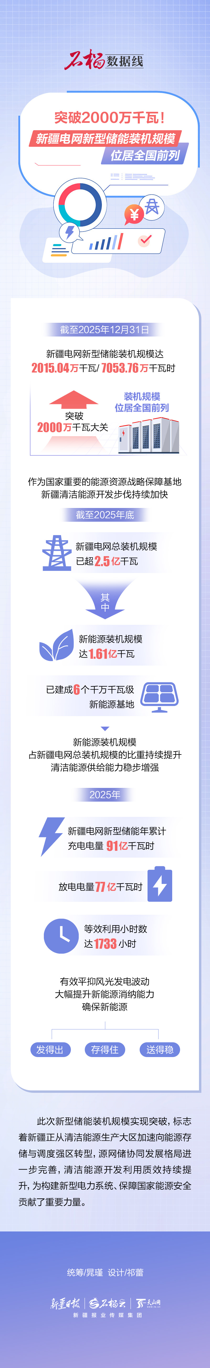 截至2025年12月31日,新疆电网新型储能装机规模达2015.04万千瓦/7053.76万千瓦时,突破2000万千瓦大关,装机规模位居全国前列。