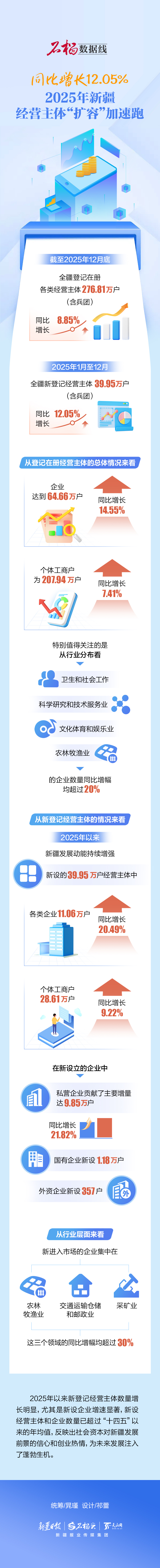 截至2025年12月底,全疆登记在册各类经营主体276.81万户(含兵团),同比增长8.85%。2025年1月至12月,全疆新登记经营主体39.95万户(含兵团),同比增长12.05%。