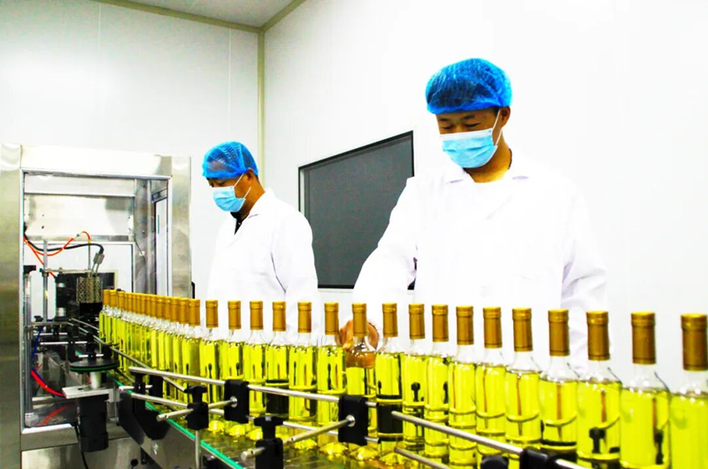新疆天鼎红花油有限公司生产车间内的自动化生产流水线。新华社记者高晗 摄