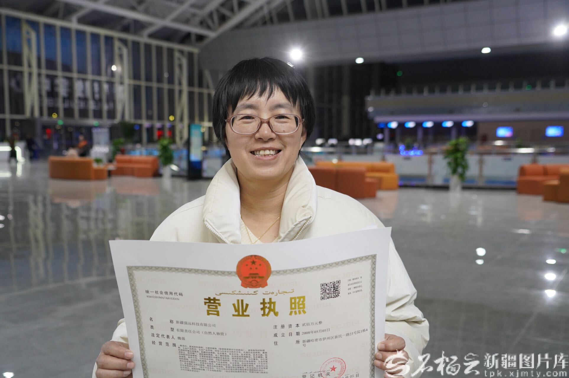2024年12月8日,新疆强远科技有限公司财务负责人杨慧敏展示哈密市第一张“个转企”营业执照(资料图)。马晶晶摄