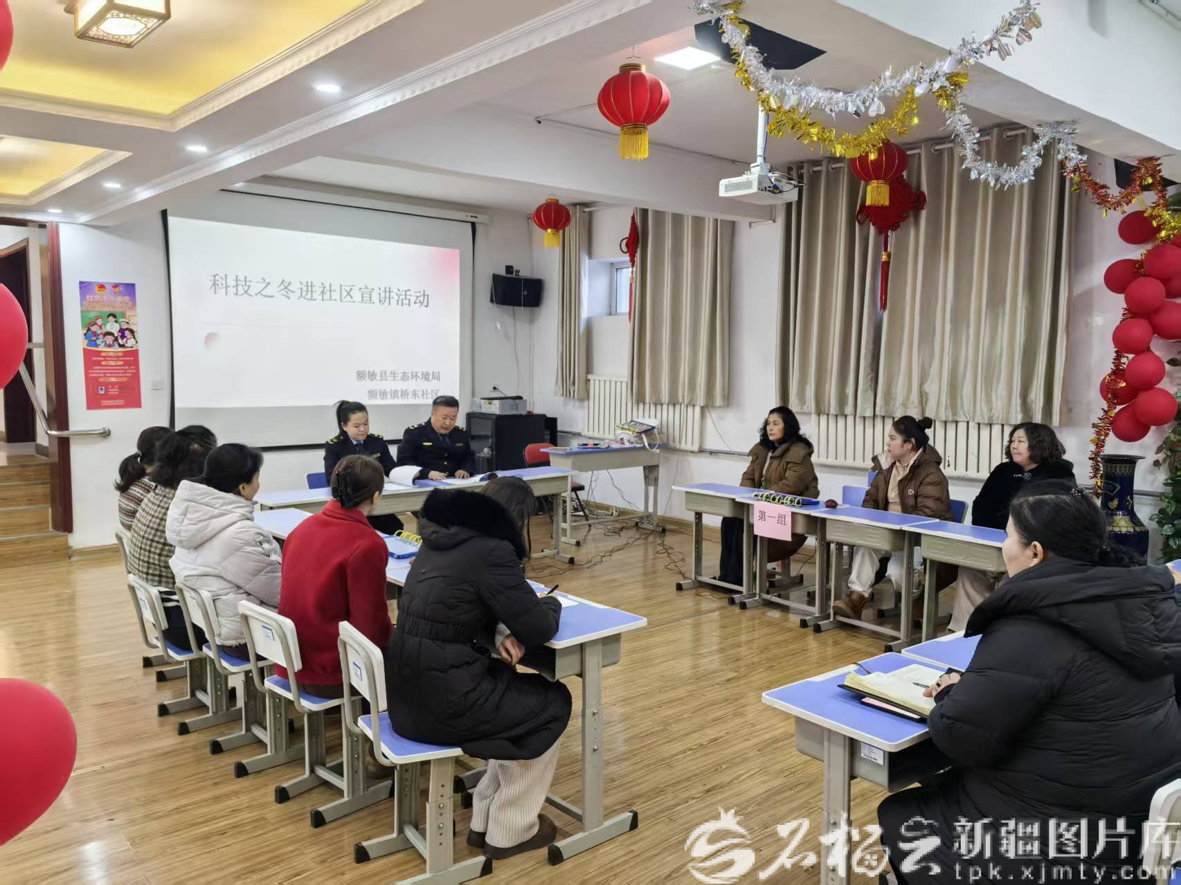 1月22日,塔城地区生态环境局裕民分局工作人员在社区开展生态宣讲时给居民讲解环保知识。焦琳摄