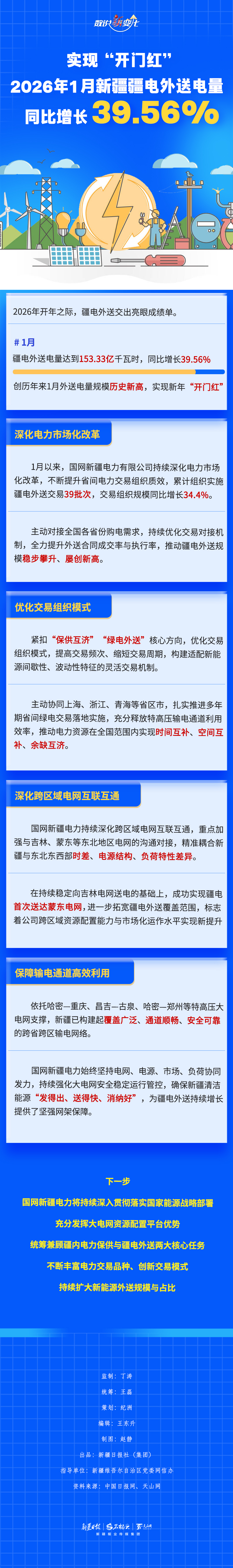 2026年1月,新疆疆电外送电量达到153.33亿千瓦时,同比增长39.56%。这一优异成绩是如何取得的?本期《数说“新”变化》一起来看看。