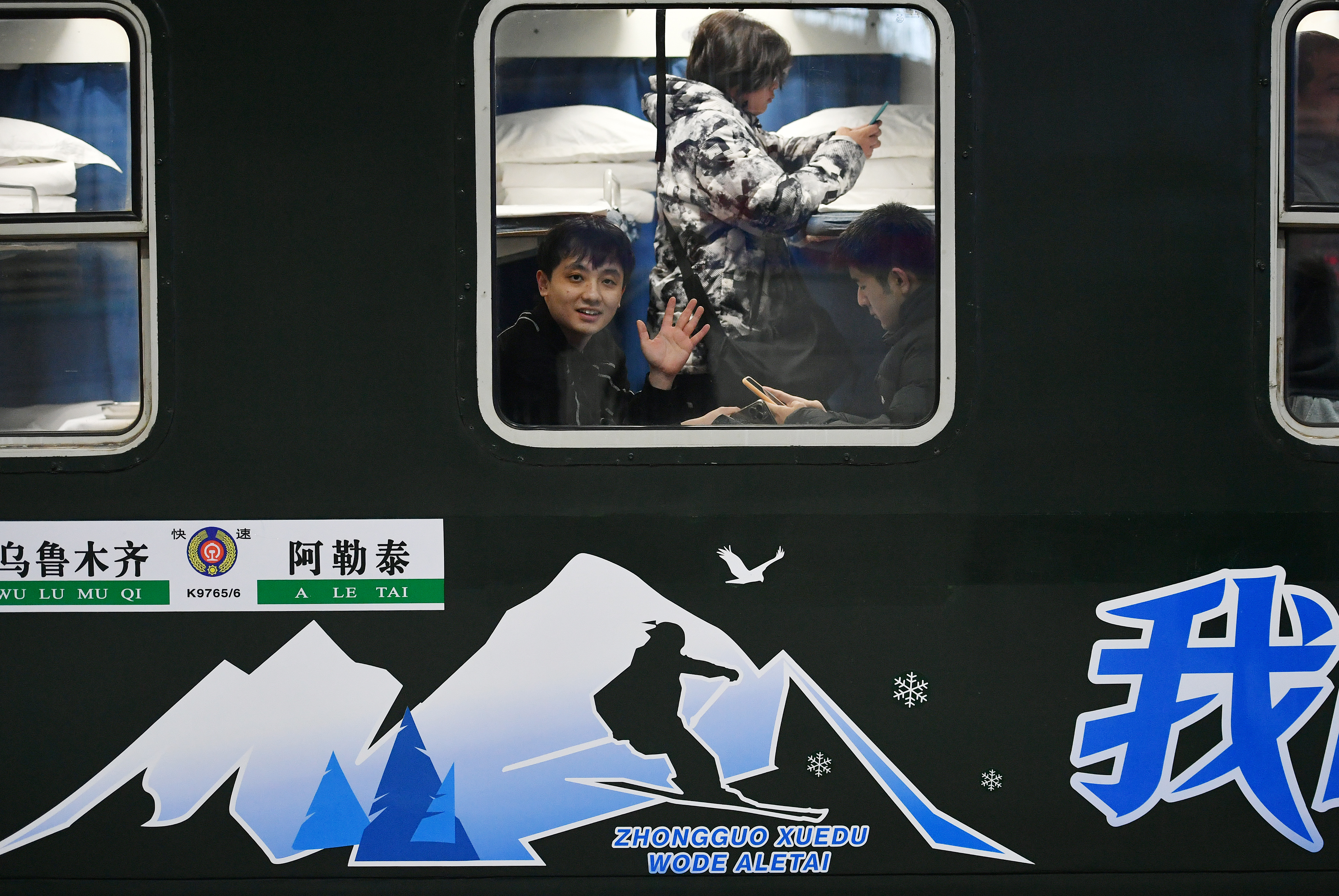 2025年12月31日晚,首趟“中国雪都·我的阿勒泰”号冰雪主题旅客列车鸣笛启程,列车缓缓驶出站台,乘客向镜头招手。天山网-新疆日报记者 邹懿摄