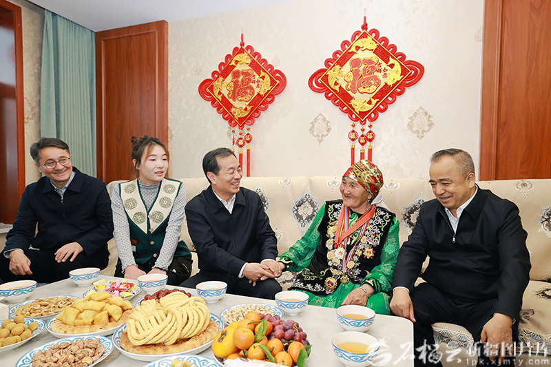 2月14日,自治区党委书记陈小江、自治区主席艾尔肯·吐尼亚孜在阿图什市中心敬老院,为各族老年人送上新春祝福。天山网-新疆日报记者 崔志坚摄