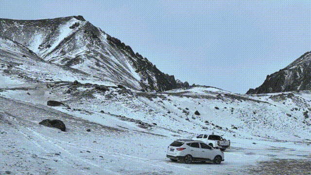图片说明:越野车一前一后,穿过几处积雪路段,海拔4100米的塔提库里人工影响天气烟炉作业点已经出现在眼前!