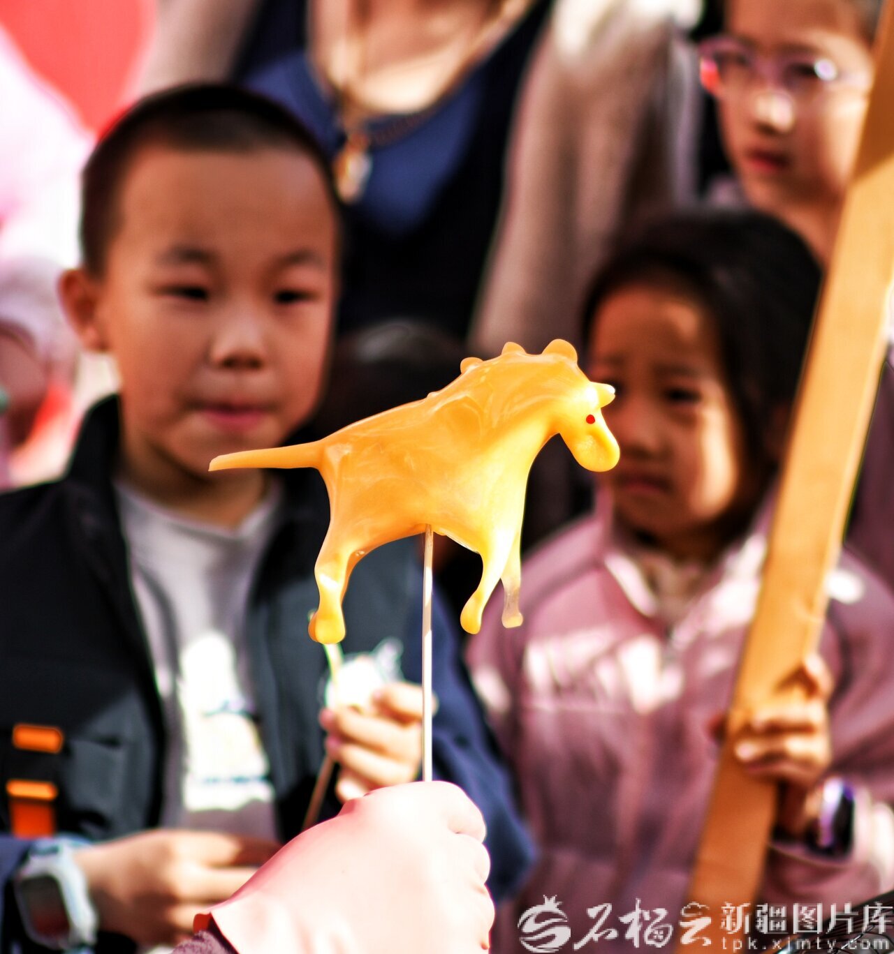 2月22日,库尔勒梨城美食街,小朋友在观赏糖塑技艺。天山网-新疆日报记者 王立华摄
