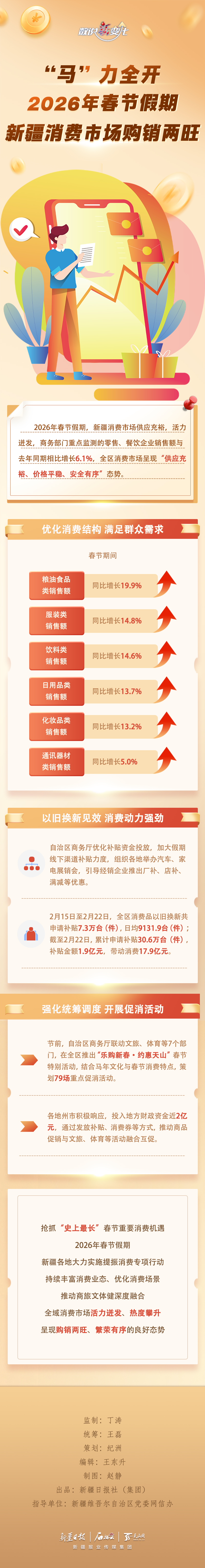 2026年春节假期,新疆消费市场供应充裕,活力迸发,商务部门重点监测的零售、餐饮企业销售额与去年同期相比增长6.1%。亮眼数据的背后,成绩是如何取得的?今天的《数说“新”变化》一起来了解。
