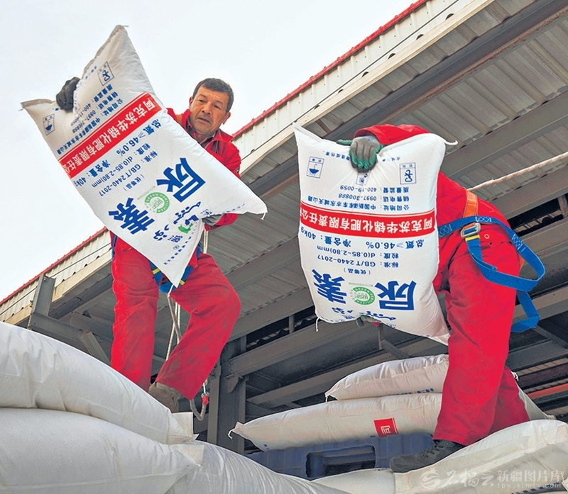 2月25日,工人在位于库车市的阿克苏华锦化肥有限责任公司装运化肥。该公司正开足马力加紧生产,保障春耕。 □袁欢欢摄