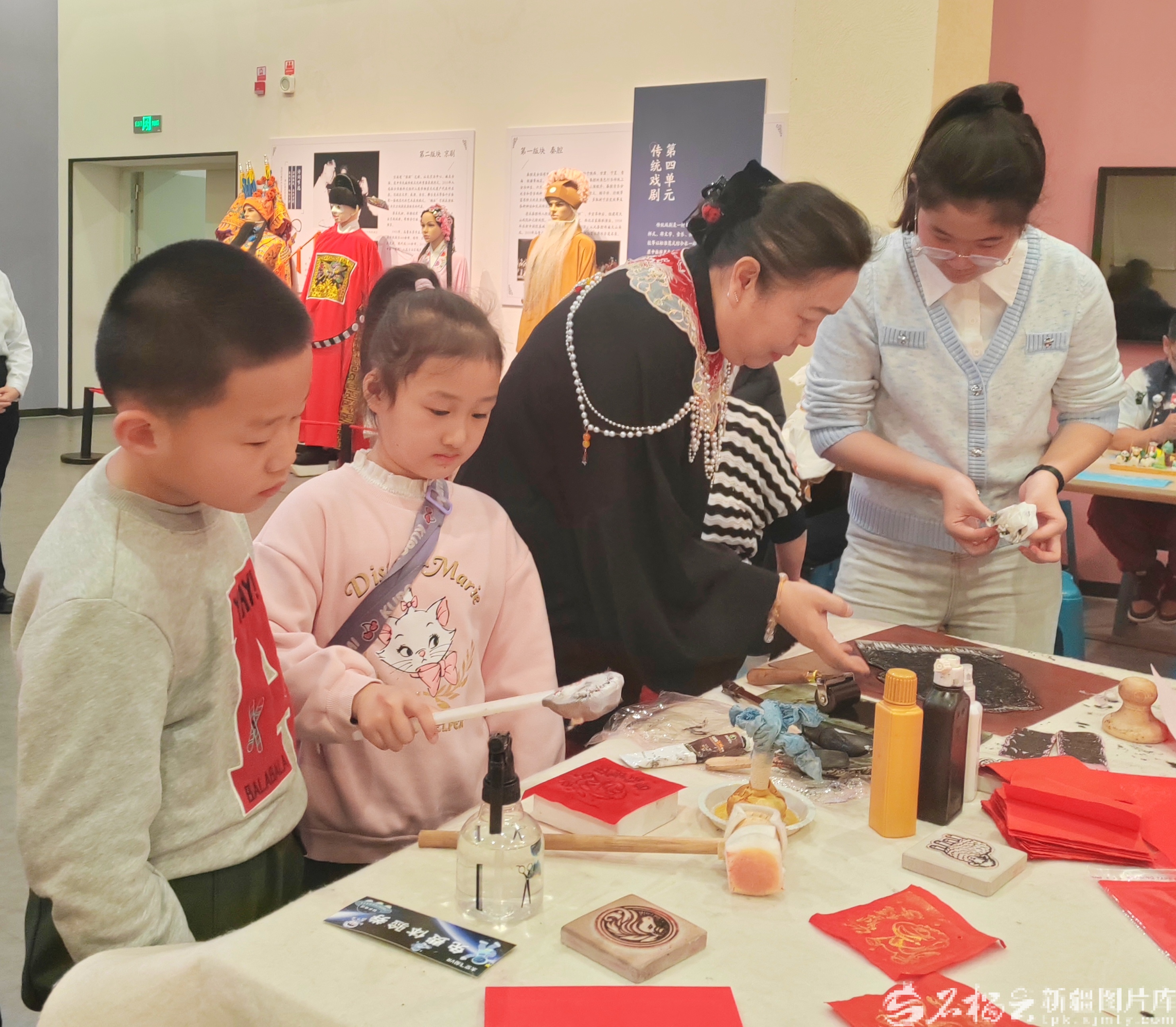 春节假期,在乌鲁木齐市博物馆,甄岐国(右2)传授观众雕版拓印技艺。天山网-新疆日报记者 贾春霞摄