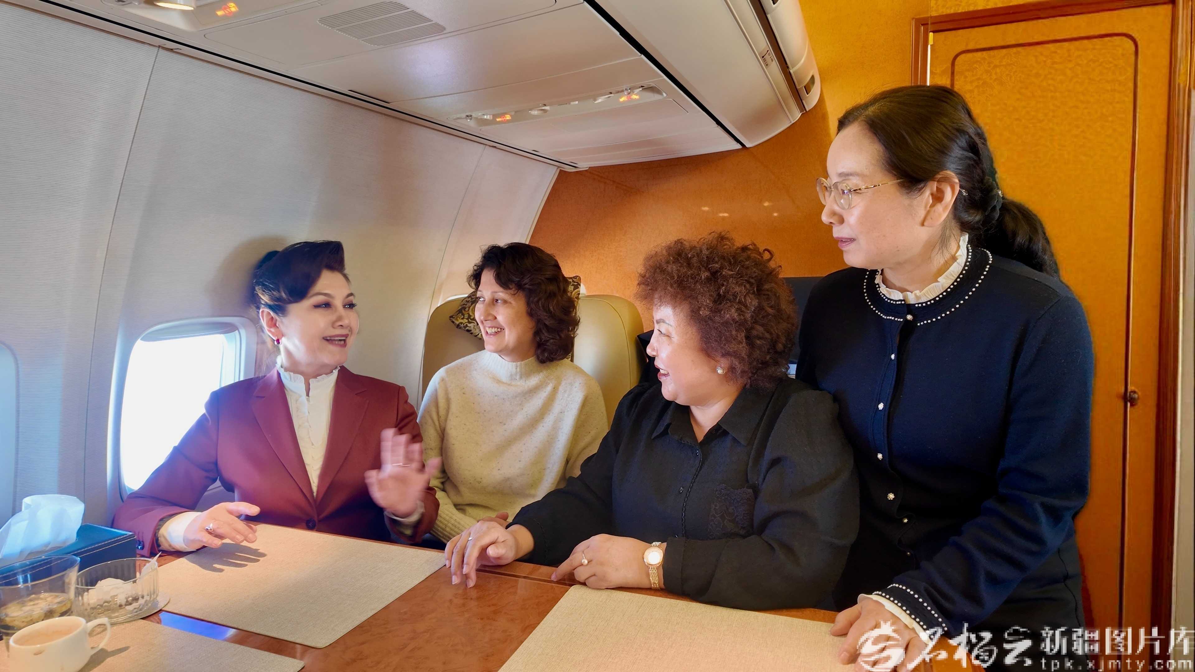 3月3日,出席全国政协十四届四次会议的住疆全国政协委员抵京。图为迪丽娜尔·阿布拉(左一)、木合拜尔·阿布都尔(左二)、阿衣木沙·托合塔洪(右二)、关芳芳委员在前往北京的航班上交流。天山网-新疆日报记者 王昕摄