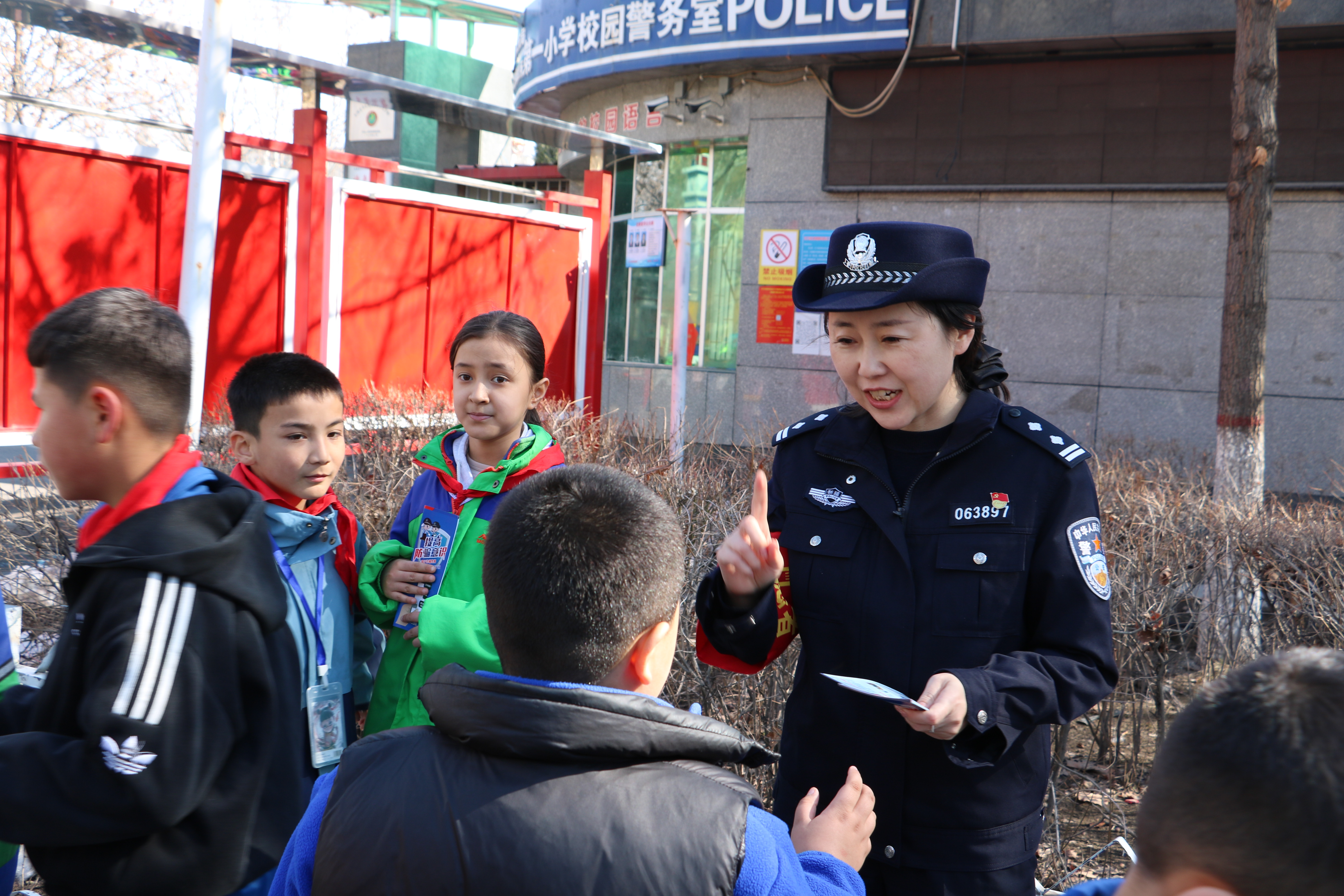 伊宁市公安局治安管理大队民警任凤梅在校园周边开展安全知识宣传。通讯员 赵娜摄