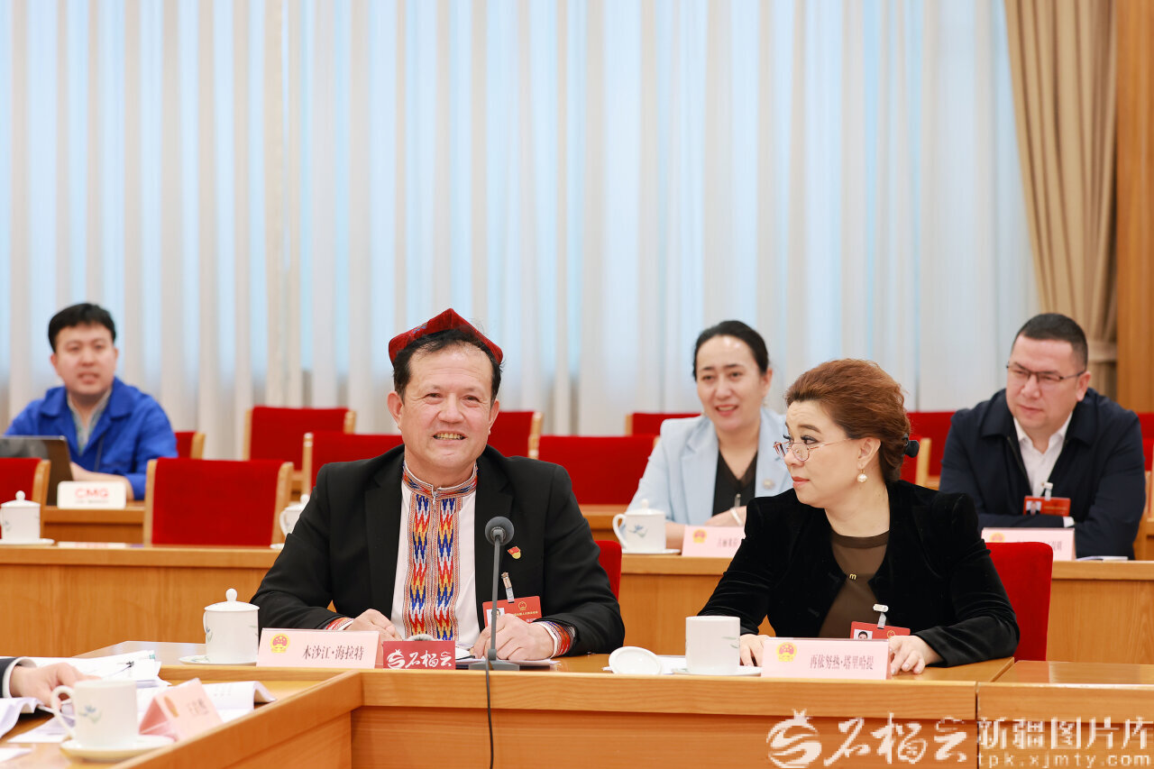 图为木沙江·海拉特代表(前排左)在发言时提出加大农牧区特色文旅发展扶持力度、深入实施文明乡风建设工程等建议。天山网-新疆日报记者 崔志坚摄