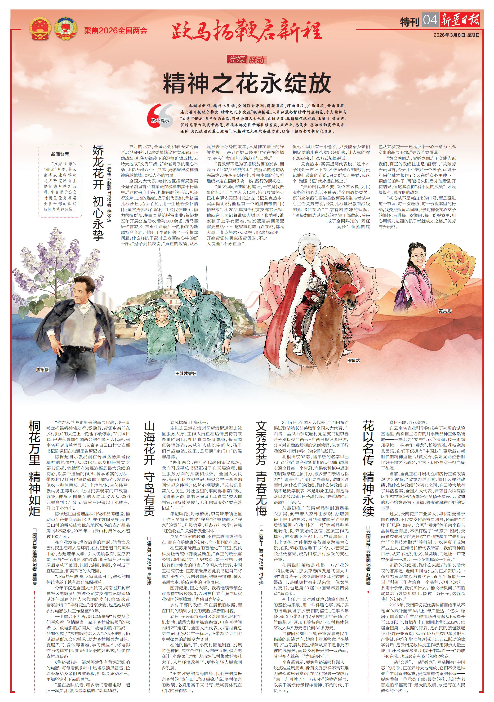 春潮启新程,精神永赓续。全国两会期间,新疆日报、河南日报、广西日报、云南日报、连云港日报联合推出“精神之花永绽放”联动报道。以象征焦裕禄精神的泡桐花、守岛精神与“文秀”“娇龙”月季等为意象,对话全国人大代表、政协委员,深情缅怀焦裕禄、王继才、黄文秀、贺娇龙等为民实干典范,展现各地党员干部扎根基层、兴产业、惠民生、善治理的实干风采,诠释“为民造福是最大政绩”,以精神之光凝聚奋进力量,以实干担当书写新时代答卷。