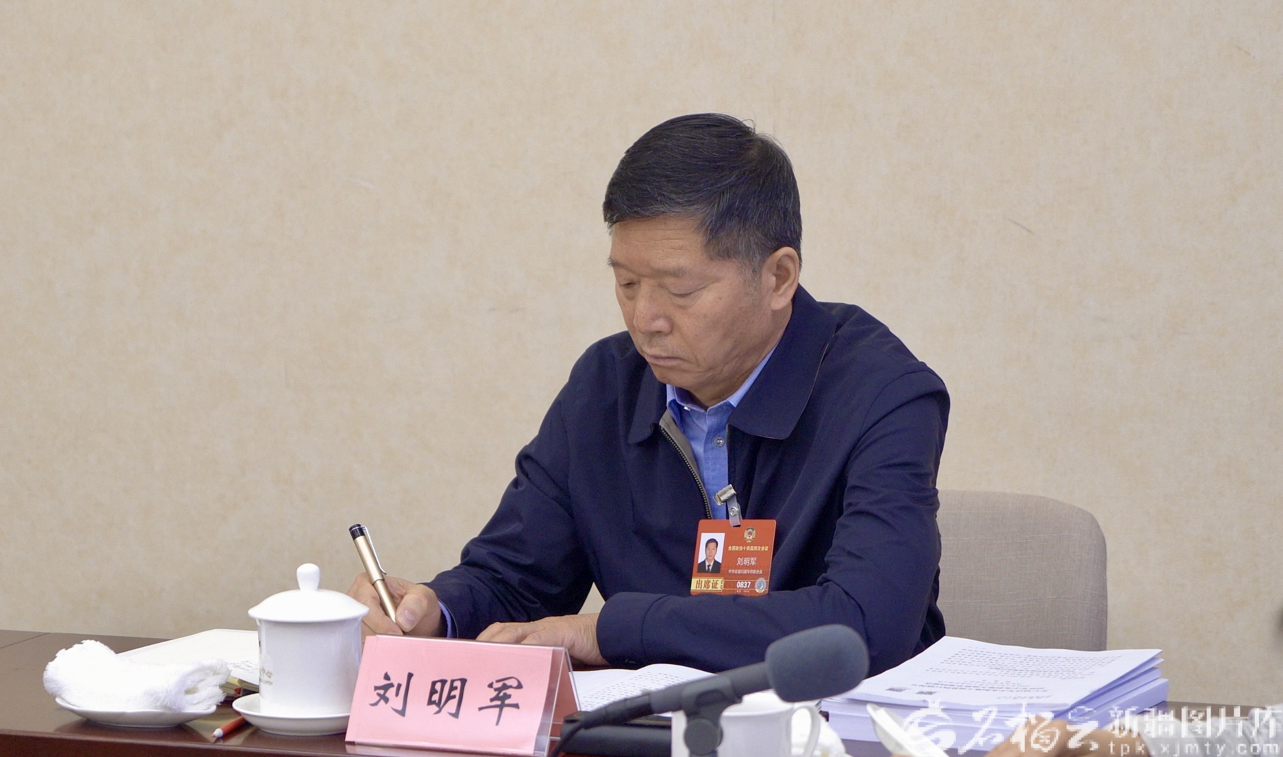 3月6日上午,出席全国政协十四届四次会议的住疆全国政协委员在各界别小组讨论政府工作报告,审议政协常委会工作报告。图为刘明军委员认真记录其他委员发言。石榴云/新疆日报记者 王昕摄