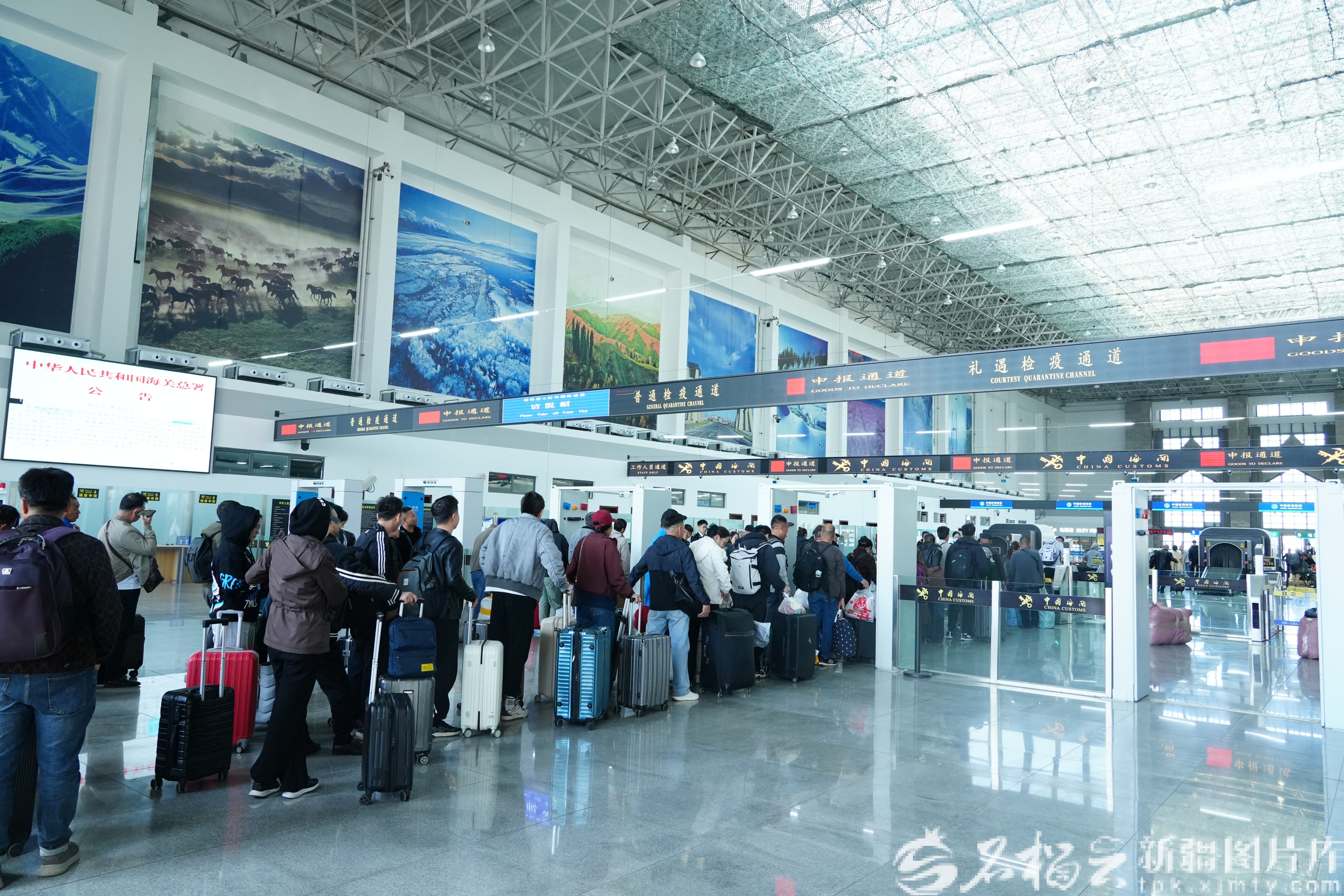 2025年4月,霍尔果斯海关旅检大厅入境通道排起长队。卢钟摄