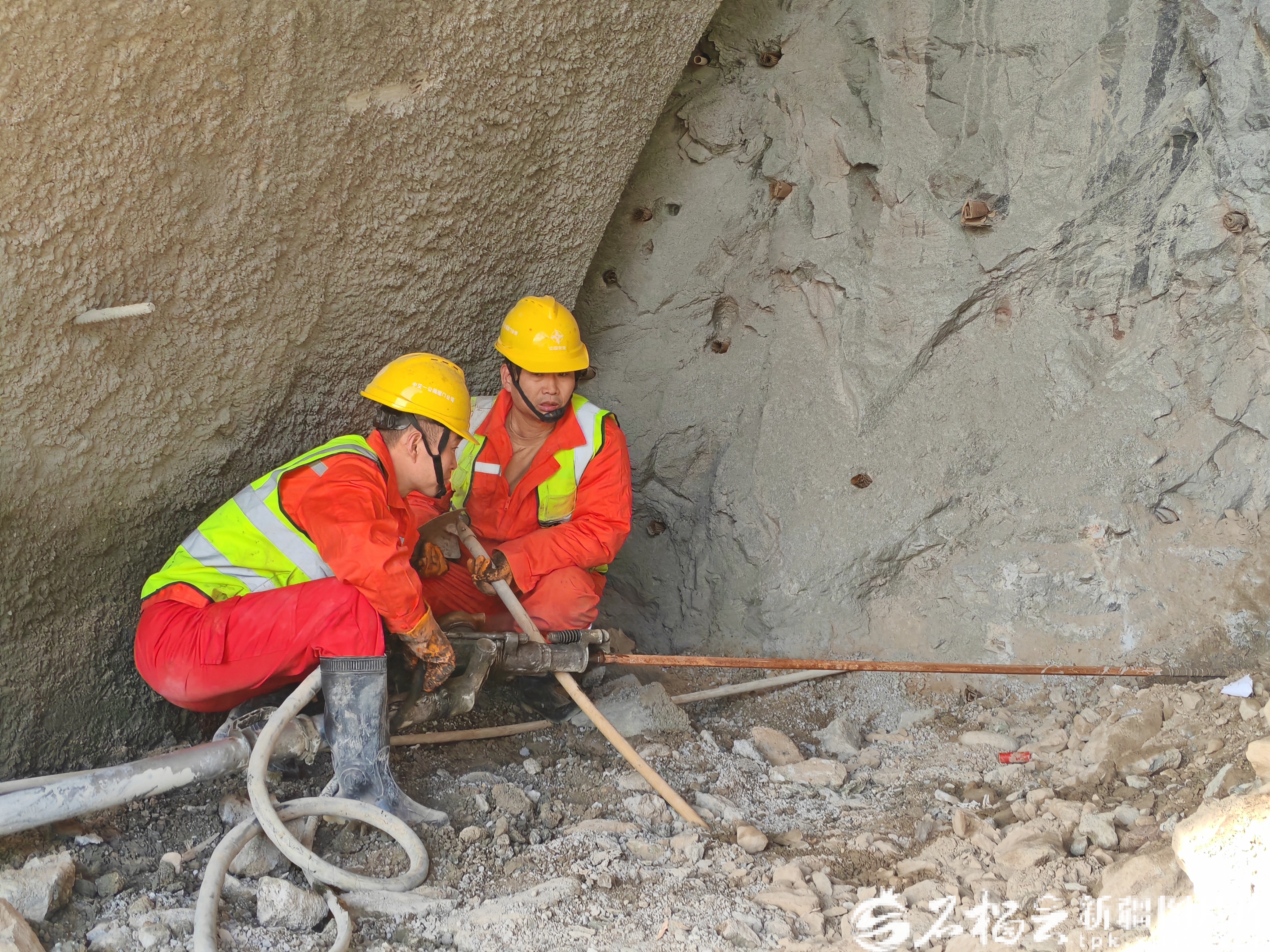在G217莎车至塔什库尔干公路建设项目(以下简称“莎塔公路项目”)第三标段錾高隧道进口端,施工人员手持气腿式凿岩机在岩壁上凿出小洞,为后续爆破作业做准备。