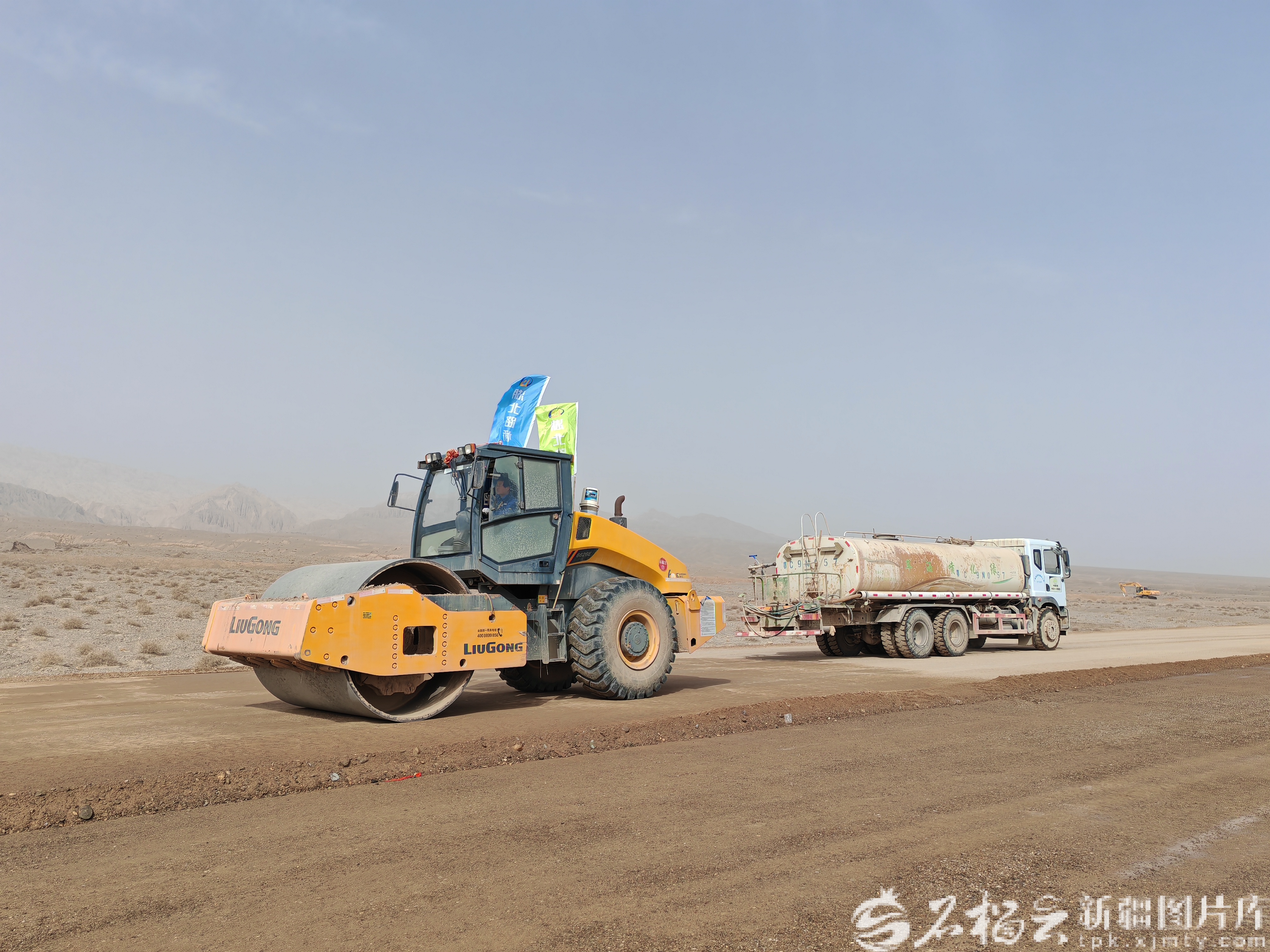 3月28日下午,施工人员驾驶压路机在G581线喀什至乌恰公路建设项目现场碾压路面。天山网-新疆日报记者 逯风暴摄