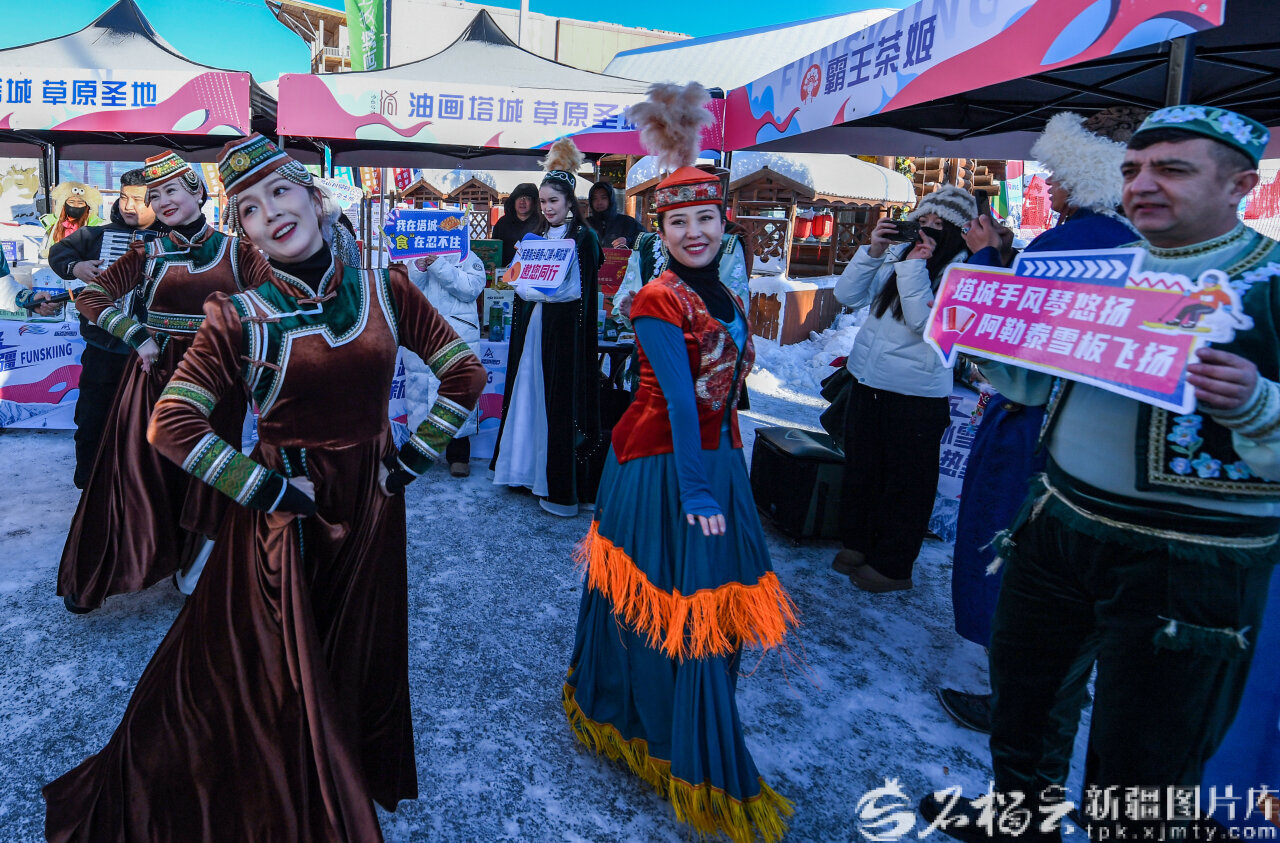 2025年12月12日,2025新疆热雪节世界野雪巡回赛(FWT)开赛仪式在阿勒泰市将军山国际滑雪度假区隆重举行。图为塔城地区演员在开幕式上推荐塔城地区旅游项目(资料图)。