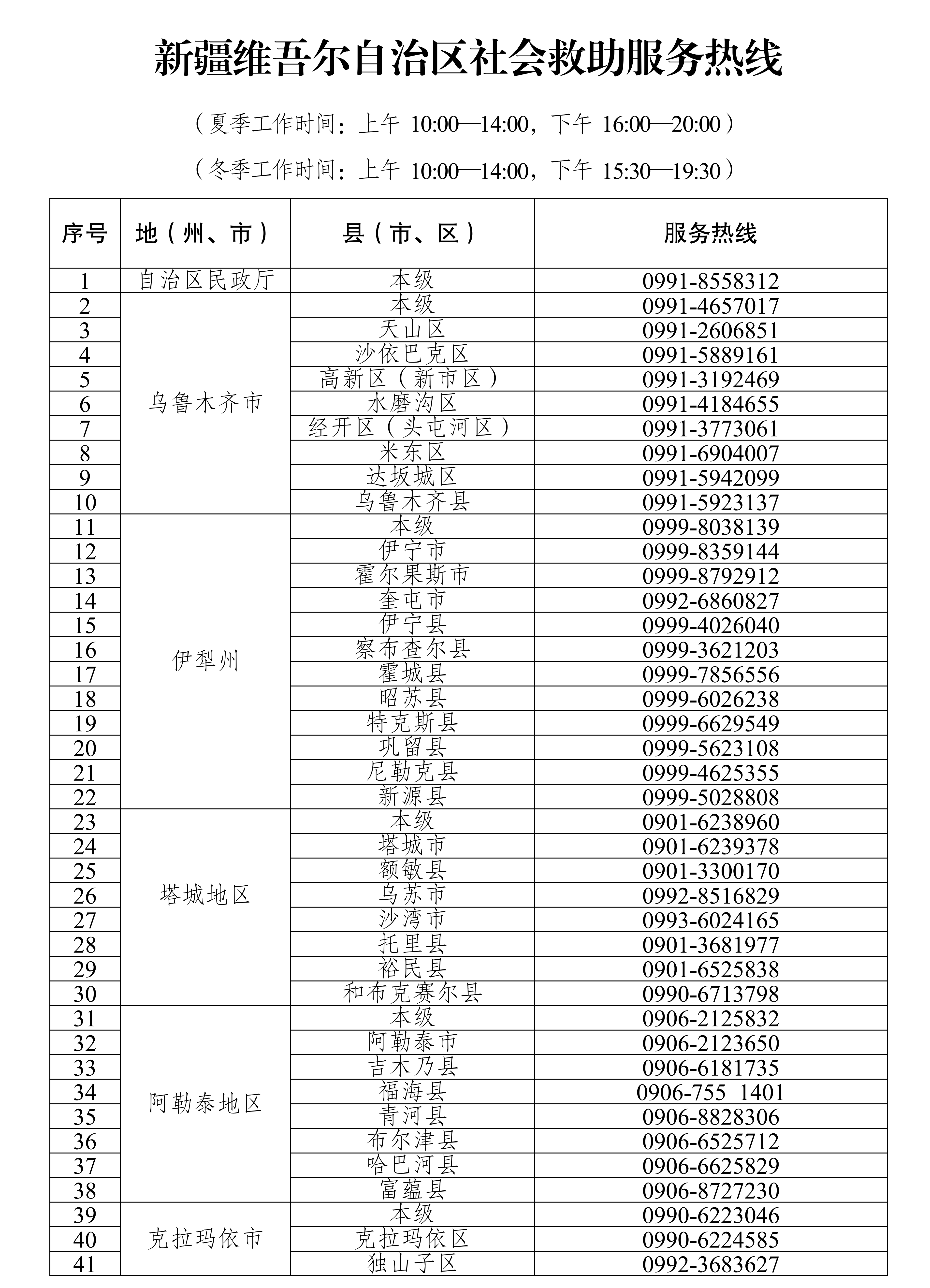 天山网-新疆日报讯(记者 李琳报道)记者从自治区民政厅获悉,为进一步畅通困难群众求助渠道,为困难群众提供便捷、高效、规范的社会救助服务,日前,全区社会救助服务热线公布,其中包括自治区本级以及14个地州市(地州市本级及各县市区)社会救助热线电话,确保困难群众求助有门、受助及时。