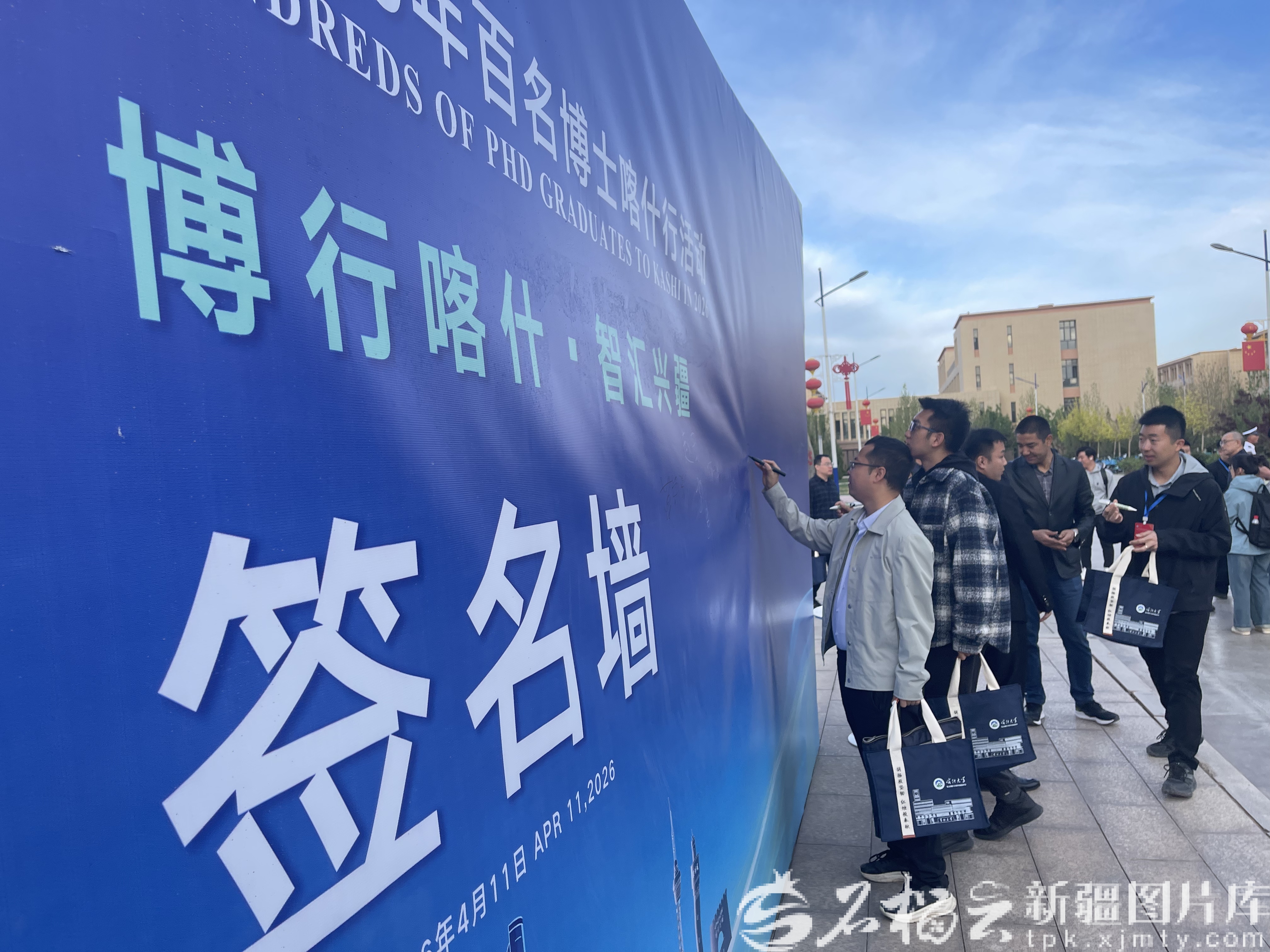 4月11日,喀什大学2026年春季“百名博士喀什行”活动中,青年博士在签名墙签字留念。天山网-新疆日报记者 赵西娅摄